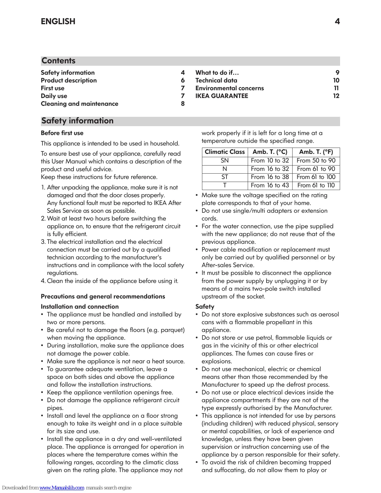 Pour utiliser au mieux votre appareil, lisez attentivement le présent Manuel d'utilisation, dans lequel figurent une description du produit et des conseils utiles. Conservez les présentes instructions pour référence future. 1. Après avoir déballé l'appareil, assurez-vous qu'il n'est pas endommagé et que les portes ferment parfaitement. Tout problème fonctionnel doit être signalé au plus tôt au service après-vente d'IKEA. 2. Il est conseillé d'attendre au moins deux heures avant de mettre l'appareil en service, afin que le circuit réfrigérant soit parfaitement efficace. 3. L'installation et le raccordement électrique doivent été réalisés par un technicien qualifié, conformément aux instructions du fabricant et aux normes locales en vigueur en matière de sécurité. 4. Nettoyez l'intérieur de l'appareil avant de l'utiliser. Précautions et recommandations générales Installation et raccordement • Au moins deux personnes sont nécessaires pour déplacer et installer l'appareil. • Prenez garde de ne pas endommager le revêtement de sol (parquet, par exemple) lorsque vous déplacez l'appareil. • Au moment de l'installation, veillez à ce que l'appareil n'écrase pas le cordon d'alimentation, sous peine de l'endommager. • N'installez pas l'appareil à proximité d'une source de chaleur. • Prévoyez un espace de part et d'autre ainsi qu'audessus de l'appareil, de façon à garantir une ventilation correcte. Respectez les consignes d'installation. • Veillez à ne jamais obstruer les orifices de ventilation de l'appareil. • N'endommagez pas les tuyaux du circuit de réfrigérant de l'appareil. • Installez et mettez l'appareil d'aplomb sur un sol en mesure de supporter son poids, à un endroit adapté à ses dimensions et à son usage. Downloaded from www.Manualslib.com manuals search engine