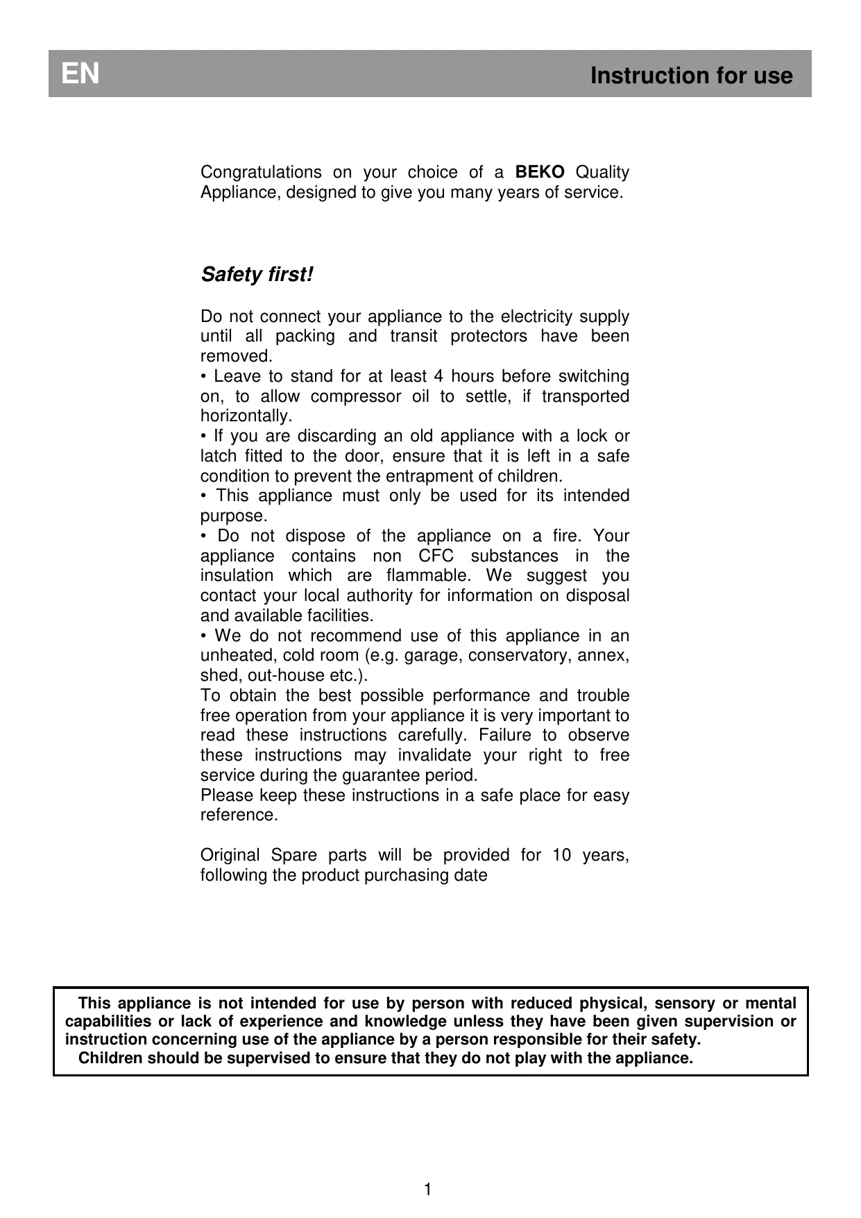 - We do not recommend use of this appliance in an unheated, cold room (e.g. garage, conservatory, annex, shed, out-house etc.). To obtain the best possible performance and trouble free operation from your appliance it is very important to read these instructions carefully. Failure to observe these instructions may invalidate your right to free service during the guarantee period. Please keep these instructions in a safe place for easy reference. Original Spare parts will be provided for 10 years, following the product purchasing date This appliance is not intended for use by person with reduced physical, sensory or mental capabilities or lack of experience and knowledge unless they have been given supervision or instruction concerning use of the appliance by a person responsible for their safety. Children should be supervised to ensure that they do not play with the appliance.