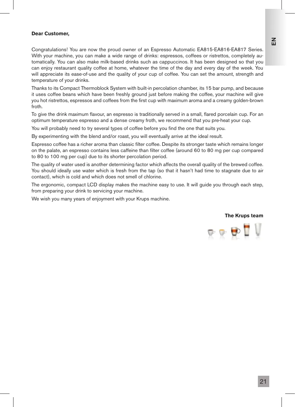 Congratulations! You are now the proud owner of an Espresso Automatic EA815-EA816-EA817 Series. With your machine, you can make a wide range of drinks: espressos, coffees or ristrettos, completely automatically. You can also make milk-based drinks such as cappuccinos. It has been designed so that you can enjoy restaurant quality coffee at home, whatever the time of the day and every day of the week. You will appreciate its ease-of-use and the quality of your cup of coffee. You can set the amount, strength and temperature of your drinks. Thanks to its Compact Thermoblock System with built-in percolation chamber, its 15 bar pump, and because it uses coffee beans which have been freshly ground just before making the coffee, your machine will give you hot ristrettos, espressos and coffees from the first cup with maximum aroma and a creamy golden-brown froth. To give the drink maximum flavour, an espresso is traditionally served in a small, flared porcelain cup. For an optimum temperature espresso and a dense creamy froth, we recommend that you pre-heat your cup. You will probably need to try several types of coffee before you find the one that suits you. By experimenting with the blend and/or roast, you will eventually arrive at the ideal result. Espresso coffee has a richer aroma than classic filter coffee. Despite its stronger taste which remains longer on the palate, an espresso contains less caffeine than filter coffee (around 60 to 80 mg per cup compared to 80 to 100 mg per cup) due to its shorter percolation period. The quality of water used is another determining factor which affects the overall quality of the brewed coffee. You should ideally use water which is fresh from the tap (so that it hasn’t had time to stagnate due to air contact), which is cold and which does not smell of chlorine. The ergonomic, compact LCD display makes the machine easy to use. It will guide you through each step, from preparing your drink to servicing your machine. We wish you many years of enjoyment with your Krups machine. The Krups team