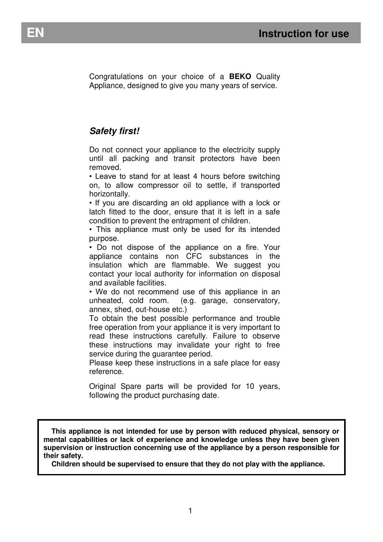 - We do not recommend use of this appliance in an unheated, cold room. (e.g. garage, conservatory, annex, shed, out-house etc.) To obtain the best possible performance and trouble free operation from your appliance it is very important to read these instructions carefully. Failure to observe these instructions may invalidate your right to free service during the guarantee period. Please keep these instructions in a safe place for easy reference. Original Spare parts will be provided for 10 years, following the product purchasing date. This appliance is not intended for use by person with reduced physical, sensory or mental capabilities or lack of experience and knowledge unless they have been given supervision or instruction concerning use of the appliance by a person responsible for their safety. Children should be supervised to ensure that they do not play with the appliance.
