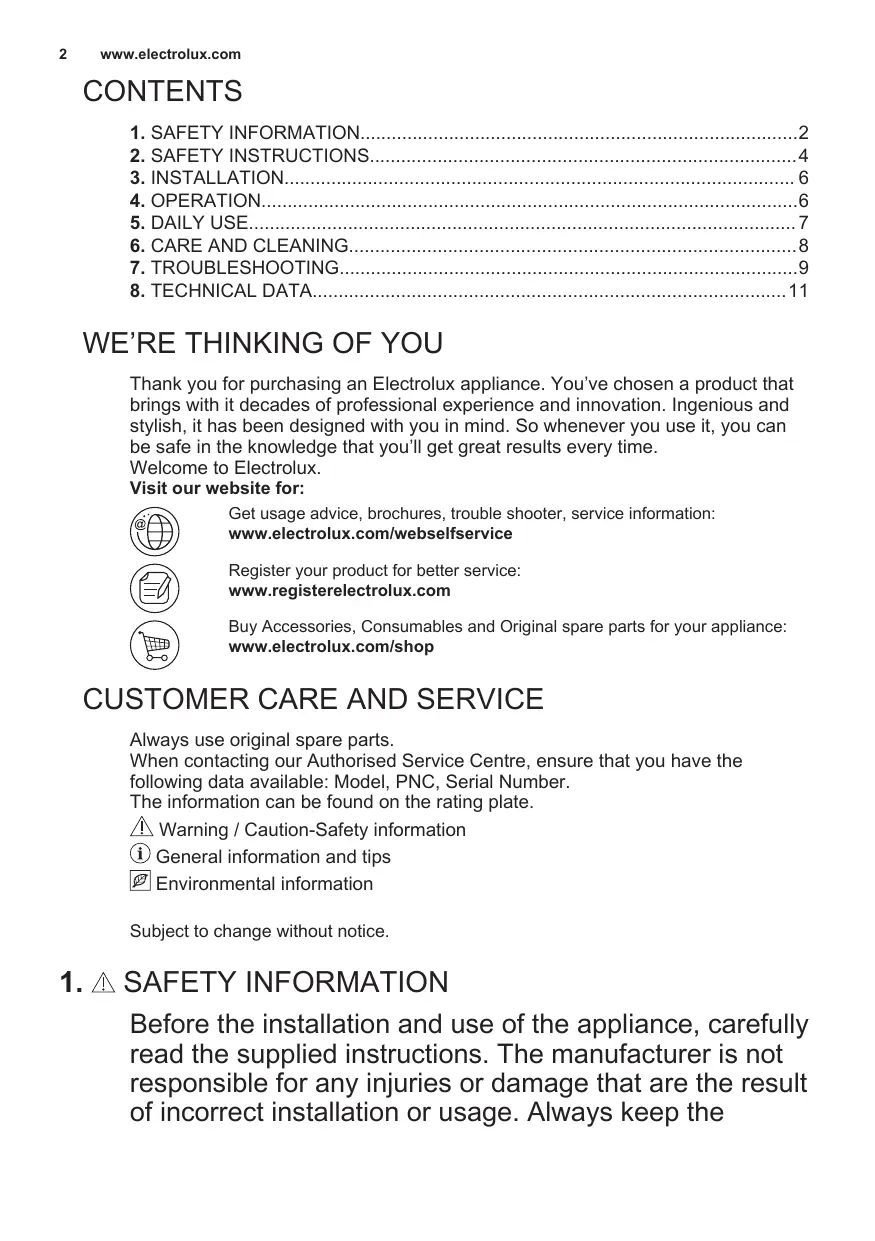 CONTENTS 1. SAFETY INFORMATION2 2. SAFETY INSTRUCTIONS4 3. INSTALLATION 6 4. OPERATION6 5. DAILY USE 7 6. CARE AND CLEANING8 7. TROUBLESHOOTING9 8. TECHNICAL DATA11