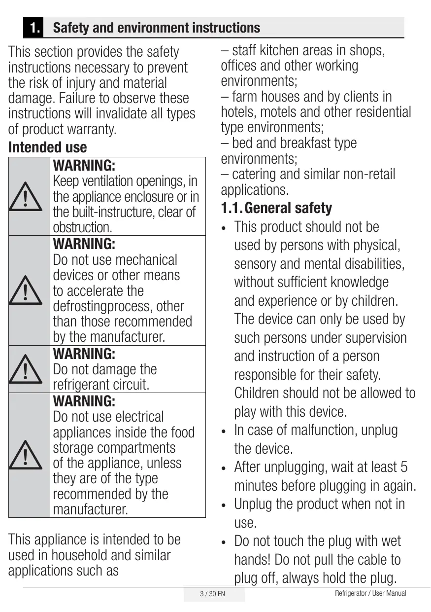 This section provides the safety instructions necessary to prevent the risk of injury and material damage. Failure to observe these instructions will invalidate all types of product warranty. Intended use WARNING: Keep ventilation openings, in the appliance enclosure or in the built-instructure, clear of obstruction. WARNING: Do not use mechanical devices or other means to accelerate the defrostingprocess, other than those recommended by the manufacturer. WARNING: Do not damage the refrigerant circuit. WARNING: Do not use electrical appliances inside the food storage compartments of the appliance, unless they are of the type recommended by the manufacturer.
