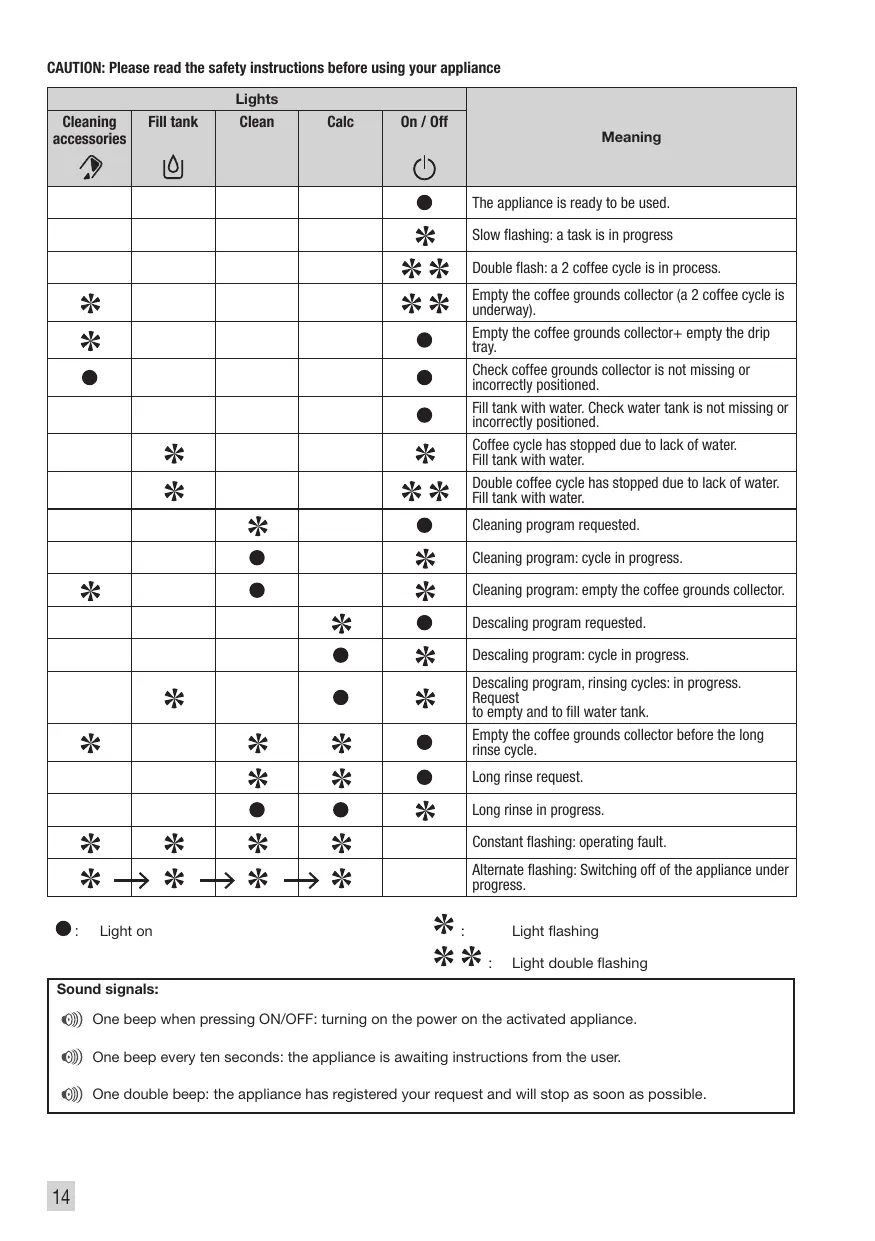 Slow flashing: a task is in progress Double flash: a 2 coffee cycle is in process. Empty the coffee grounds collector (a 2 coffee cycle is underway). Empty the coffee grounds collector+ empty the drip tray. Check coffee grounds collector is not missing or incorrectly positioned. Fill tank with water. Check water tank is not missing or incorrectly positioned. Coffee cycle has stopped due to lack of water. Fill tank with water. Double coffee cycle has stopped due to lack of water. Fill tank with water. Cleaning program requested. Cleaning program: cycle in progress. Cleaning program: empty the coffee grounds collector. Descaling program requested. Descaling program: cycle in progress. Descaling program, rinsing cycles: in progress. Request to empty and to fill water tank. Empty the coffee grounds collector before the long rinse cycle. Long rinse request. Long rinse in progress. Constant flashing: operating fault. Alternate flashing: Switching off of the appliance under progress. :