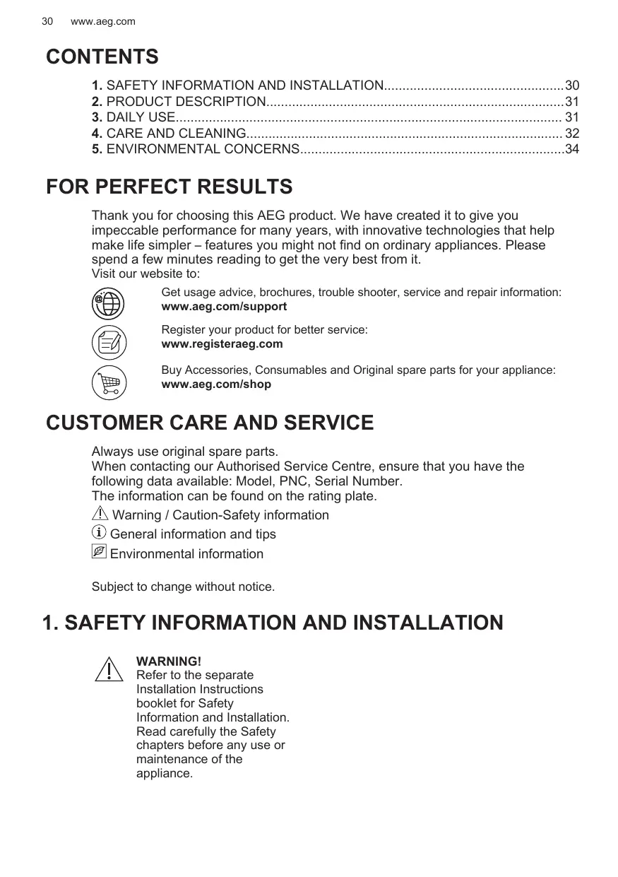 FOR PERFECT RESULTS Thank you for choosing this AEG product. We have created it to give you impeccable performance for many years, with innovative technologies that help make life simpler – features you might not find on ordinary appliances. Please spend a few minutes reading to get the very best from it.