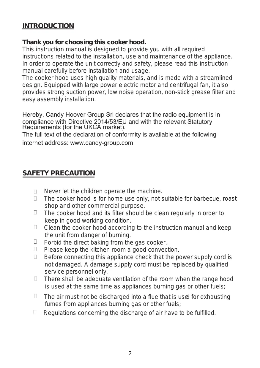 This instruction manual is designed to provide you with all required instructions related to the installation, use and maintenance of the appliance. In order to operate the unit correctly and safety, please read this instruction manual carefully before installation and usage. The cooker hood uses high quality materials, and is made with a streamlined design. Equipped with large power electric motor and centrifugal fan, it also provides strong suction power, low noise operation, non-stick grease filter and easy assembly installation. Hereby, Candy Hoover Group Srl declares that the radio equipment is in compliance with Directive 2014/53/EU and with the relevant Statutory Requirements (for the UKCA market). The full text of the declaration of conformity is available at the following internet address: www.candy-group.com