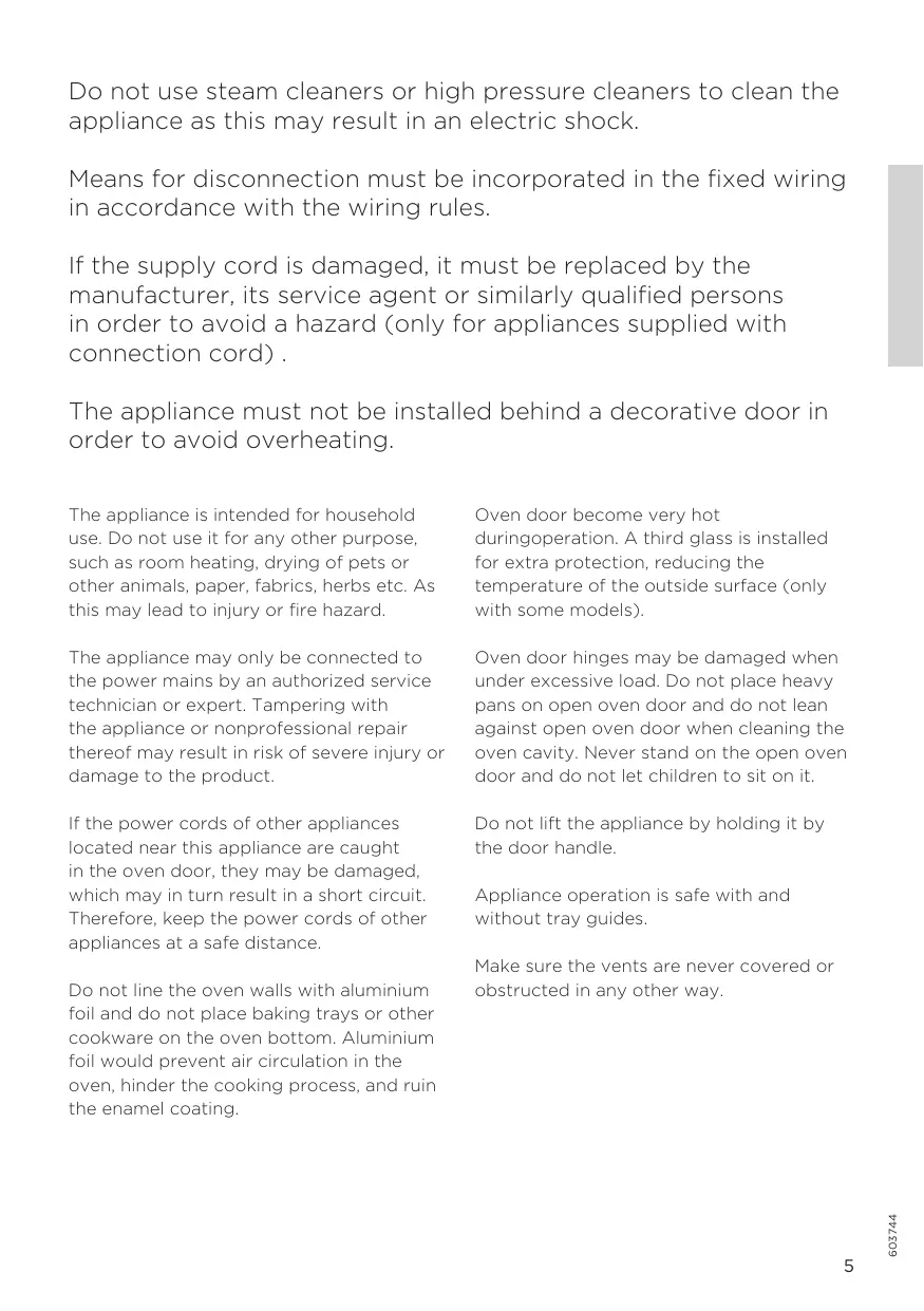 Do not use steam cleaners or high pressure cleaners to clean the appliance as this may result in an electric shock. Means for disconnection must be incorporated in the fixed wiring in accordance with the wiring rules. If the supply cord is damaged, it must be replaced by the manufacturer, its service agent or similarly qualified persons in order to avoid a hazard (only for appliances supplied with connection cord) . The appliance must not be installed behind a decorative door in order to avoid overheating. The appliance is intended for household use. Do not use it for any other purpose, such as room heating, drying of pets or other animals, paper, fabrics, herbs etc. As this may lead to injury or fire hazard.