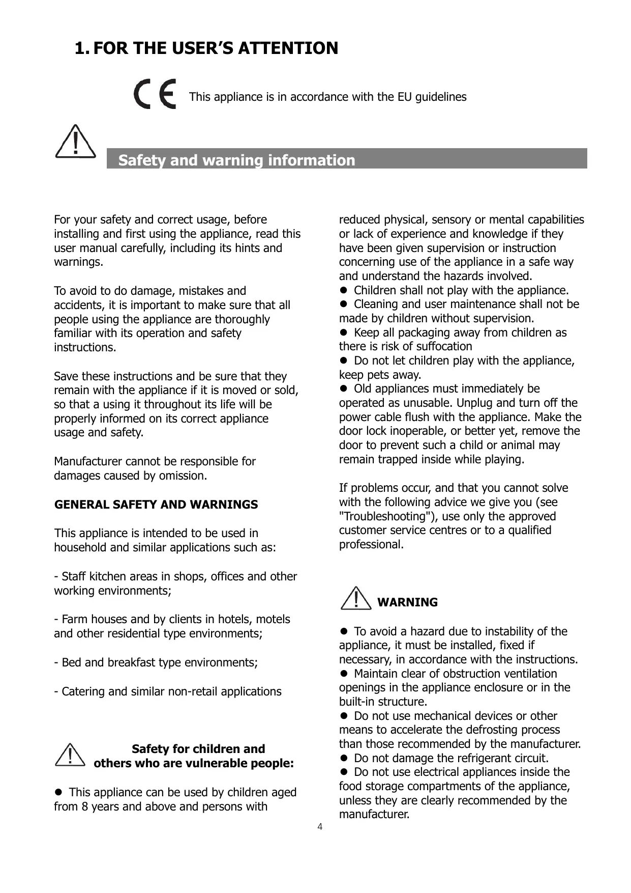 1. FOR THE USER’S ATTENTION This appliance is in accordance with the EU guidelines