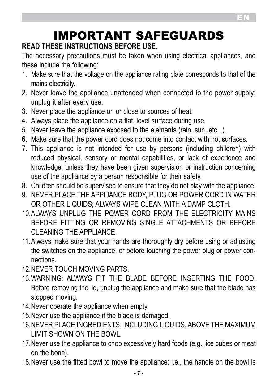 The necessary precautions must be taken when using electrical appliances, and these include the following: 1. Make sure that the voltage on the appliance rating plate corresponds to that of the mains electricity. 2. Never leave the appliance unattended when connected to the power supply; unplug it after every use. 3. Never place the appliance on or close to sources of heat. 4. Always place the appliance on a flat, level surface during use. 5. Never leave the appliance exposed to the elements (rain, sun, etc...). 6. Make sure that the power cord does not come into contact with hot surfaces. 7. This appliance is not intended for use by persons (including children) with reduced physical, sensory or mental capabilities, or lack of experience and knowledge, unless they have been given supervision or instruction concerning use of the appliance by a person responsible for their safety. 8. Children should be supervised to ensure that they do not play with the appliance. 9. NEVER PLACE THE APPLIANCE BODY, PLUG OR POWER CORD IN WATER OR OTHER LIQUIDS; ALWAYS WIPE CLEAN WITH A DAMP CLOTH. 10. ALWAYS UNPLUG THE POWER CORD FROM THE ELECTRICITY MAINS BEFORE FITTING OR REMOVING SINGLE ATTACHMENTS OR BEFORE CLEANING THE APPLIANCE. 11. Always make sure that your hands are thoroughly dry before using or adjusting the switches on the appliance, or before touching the power plug or power connections. 12. NEVER TOUCH MOVING PARTS. 13. WARNING: ALWAYS FIT THE BLADE BEFORE INSERTING THE FOOD. Before removing the lid, unplug the appliance and make sure that the blade has stopped moving. 14. Never operate the appliance when empty. 15. Never use the appliance if the blade is damaged. 16. NEVER PLACE INGREDIENTS, INCLUDING LIQUIDS, ABOVE THE MAXIMUM LIMIT SHOWN ON THE BOWL. 17. Never use the appliance to chop excessively hard foods (e.g., ice cubes or meat on the bone). 18. Never use the fitted bowl to move the appliance; i.e., the handle on the bowl is -7-
