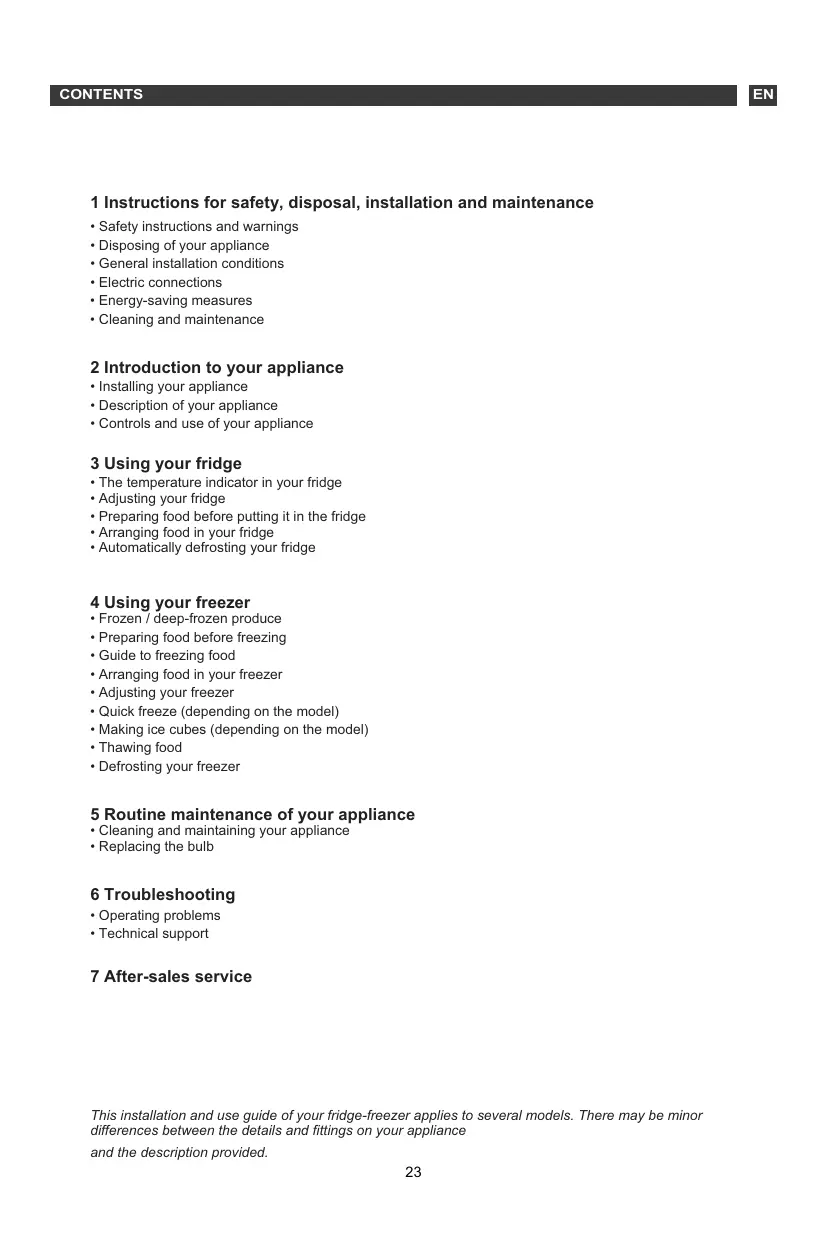 - Technical support 7 After-sales service This installation and use guide of your fridge-freezer applies to several models. There may be minor differences between the details and fittings on your appliance and the description provided.