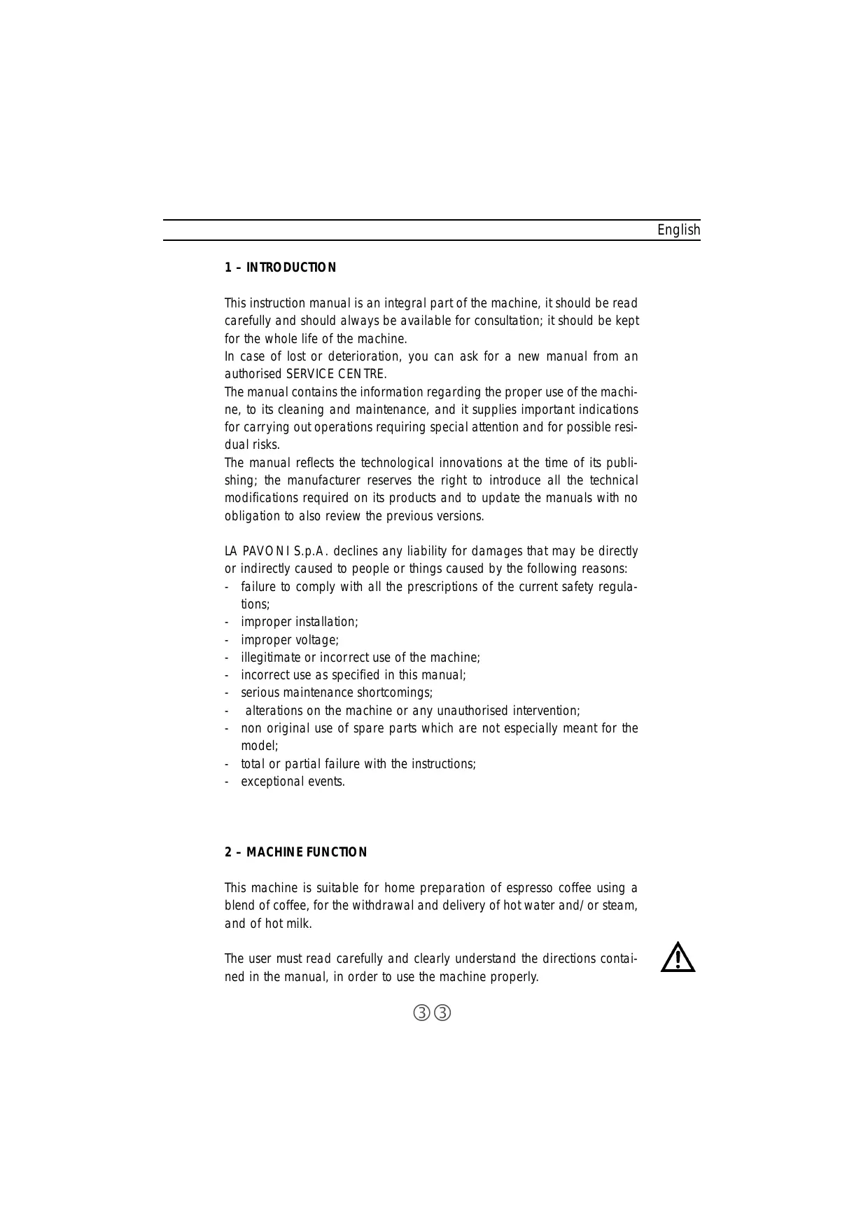 We thank you for buying one of our products, made in accordance with the most up-to date technological innovations. Following carefully the simple operations of use contained in this manual, which comply with essential safety regulations, you will get the best performances and notice the remarkable reliability of this product along the years. In case of running troubles, our network of Service Centres is at your complete disposal from now on.