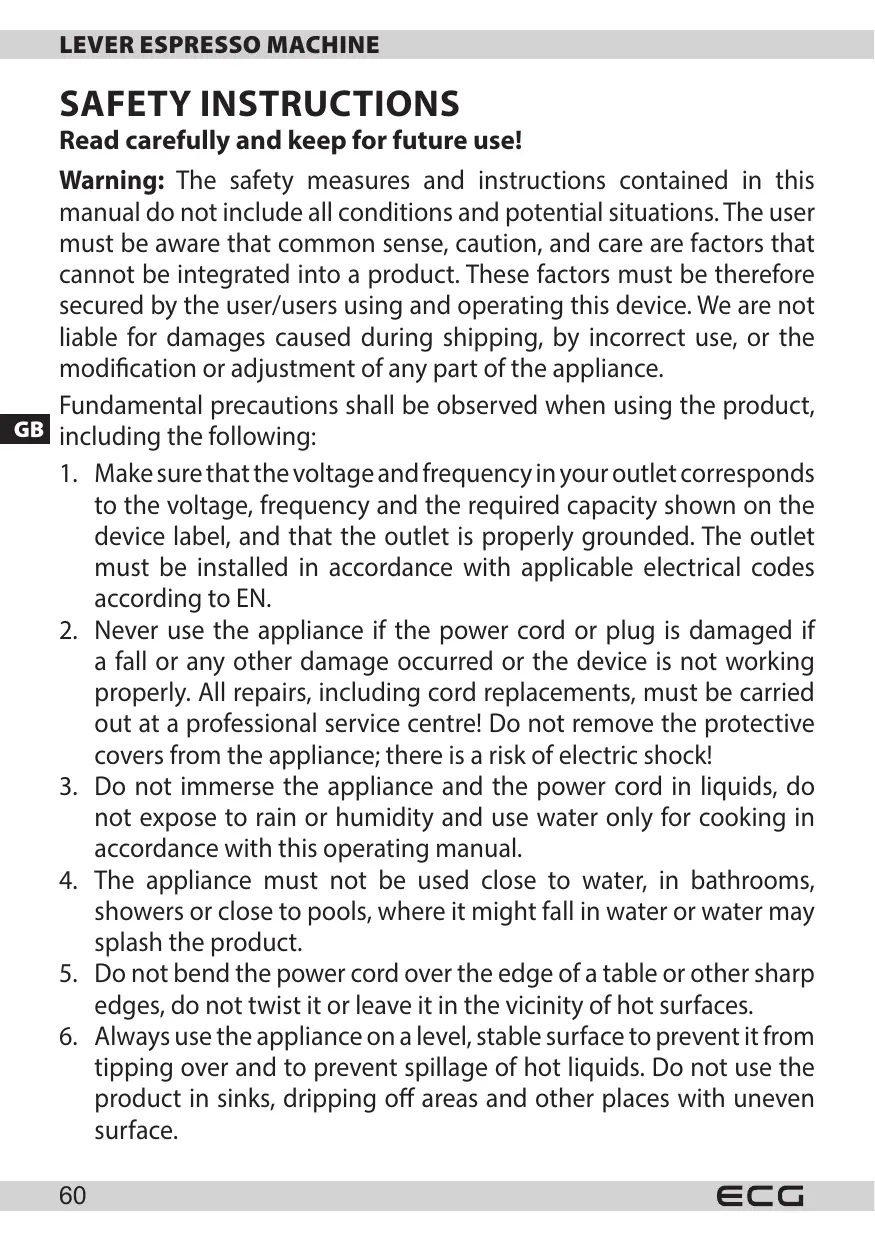 - ECG is not liable for damage or injury caused by negligence or improper use. Prior to use do not forget to read carefully all instructions and information. The external surface of this device heats up and may cause burns. Do not leave unattended when children are present.
