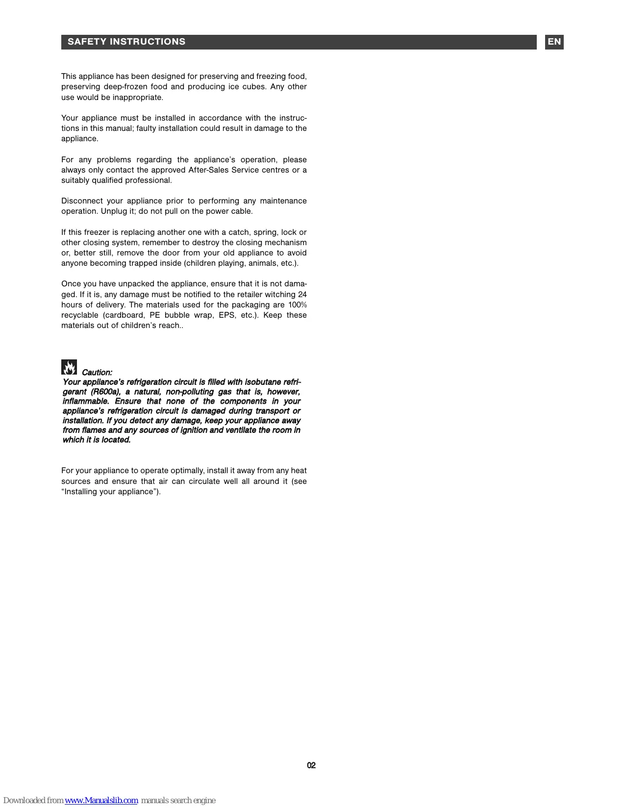 Your appliance’s refrigeration circuit is filled with isobutane refrigerant (R600a), a natural, non-polluting gas that is, however, inflammable. Ensure that none of the components in your appliance’s refrigeration circuit is damaged during transport or installation. If you detect any damage, keep your appliance away from flames and any sources of ignition and ventilate the room in which it is located.