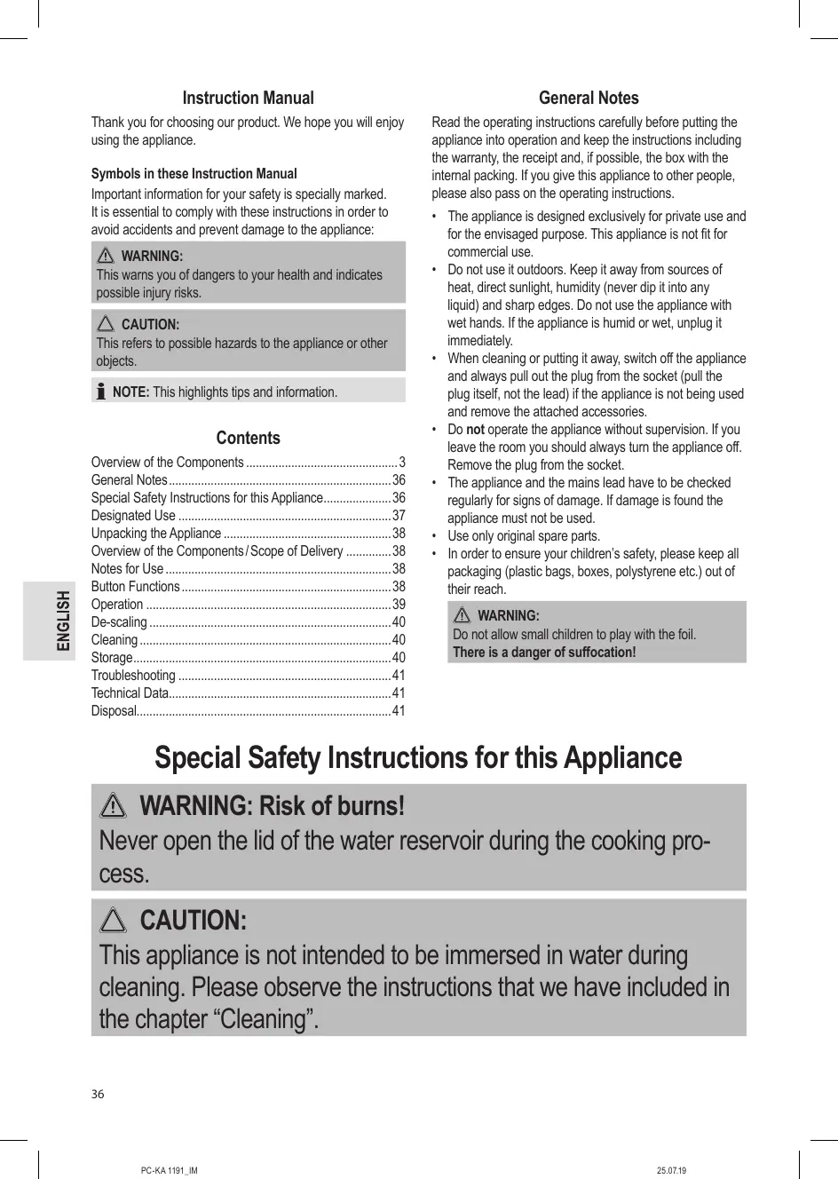 WARNING: Risk of burns! Never open the lid of the water reservoir during the cooking process. CAUTION: This appliance is not intended to be immersed in water during cleaning. Please observe the instructions that we have included in the chapter “Cleaning”. 36