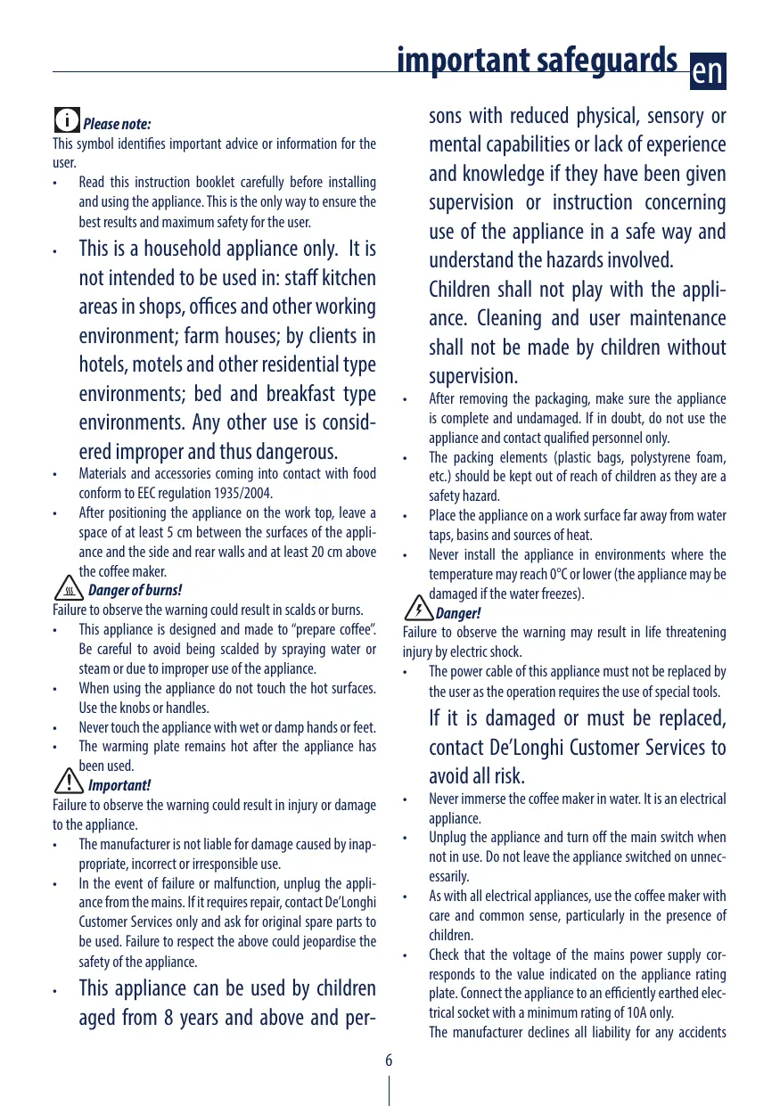 • After positioning the appliance on the work top, leave a space of at least 5 cm between the surfaces of the appliance and the side and rear walls and at least 20 cm above the coffee maker. Danger of burns! Failure to observe the warning could result in scalds or burns. • This appliance is designed and made to “prepare coffee”. Be careful to avoid being scalded by spraying water or steam or due to improper use of the appliance. • When using the appliance do not touch the hot surfaces. Use the knobs or handles. • Never touch the appliance with wet or damp hands or feet. • The warming plate remains hot after the appliance has been used. Important! Failure to observe the warning could result in injury or damage to the appliance. • The manufacturer is not liable for damage caused by inappropriate, incorrect or irresponsible use. • In the event of failure or malfunction, unplug the appliance from the mains. If it requires repair, contact De’Longhi Customer Services only and ask for original spare parts to be used. Failure to respect the above could jeopardise the safety of the appliance. •