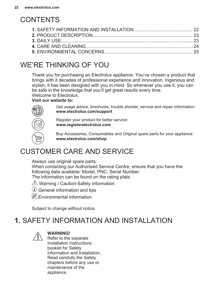 When contacting our Authorised Service Centre, ensure that you have the following data available: Model, PNC, Serial Number. The information can be found on the rating plate. Warning / Caution-Safety information General information and tips Environmental information Subject to change without notice.