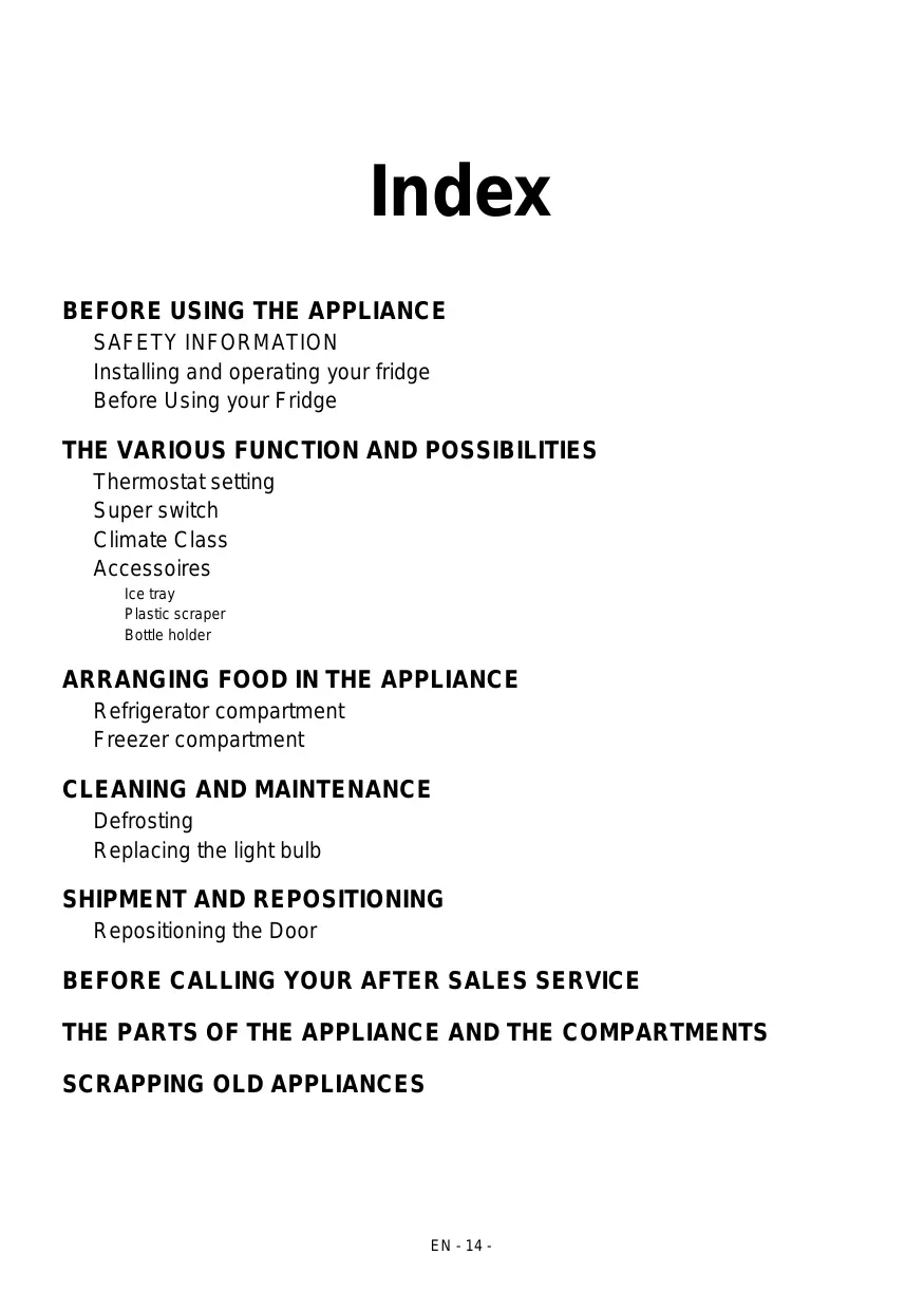 BEFORE CALLING YOUR AFTER SALES SERVICE THE PARTS OF THE APPLIANCE AND THE COMPARTMENTS SCRAPPING OLD APPLIANCES EN - 14 -