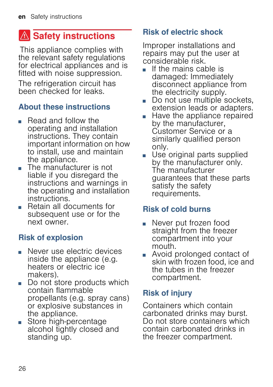 Read and follow the operating and installation instructions. They contain important information on how to install, use and maintain the appliance. The manufacturer is not liable if you disregard the instructions and warnings in the operating and installation instructions. Retain all documents for subsequent use or for the next owner. Risk of electric shock Improper installations and repairs may put the user at considerable risk. If the mains cable is damaged: Immediately disconnect appliance from the electricity supply. Do not use multiple sockets, extension leads or adapters. Have the appliance repaired by the manufacturer, Customer Service or a similarly qualified person only. Use original parts supplied by the manufacturer only. The manufacturer guarantees that these parts satisfy the safety requirements. Risk of cold burns