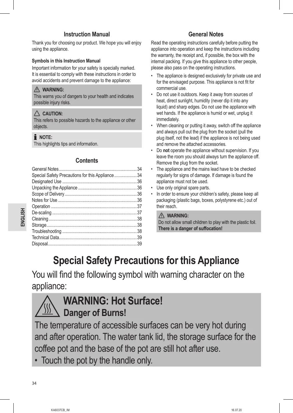 Technical Data Model:..................................................................KA 6037 CB Power supply:.....................................220 - 240 V~, 50 - 60 Hz Power consumption:......................................................800 W Filling quantity:................................................approx. 1.2 litre Protection class:...................................................................... Net weight:...................................................... approx. 1.85 kg The right to make technical and design modifications in the course of continuous product development remains reserved. This appliance has been tested according to all relevant current CE guidelines, such as electromagnetic compatibility and low voltage directives, and is manufactured according to the latest safety regulations. Disposal Meaning of the “Dustbin” Symbol Protect our environment: do not dispose of electrical equipment in the domestic waste. Please return any electrical equipment that you will no longer use to the collection points provided for their disposal. This helps avoid the potential effects of incorrect disposal on the environment and human health. This will contribute to the recycling and other forms of re-utilisation of electrical and electronic equipment. Information concerning where the equipment can be disposed of can be obtained from your local authority.