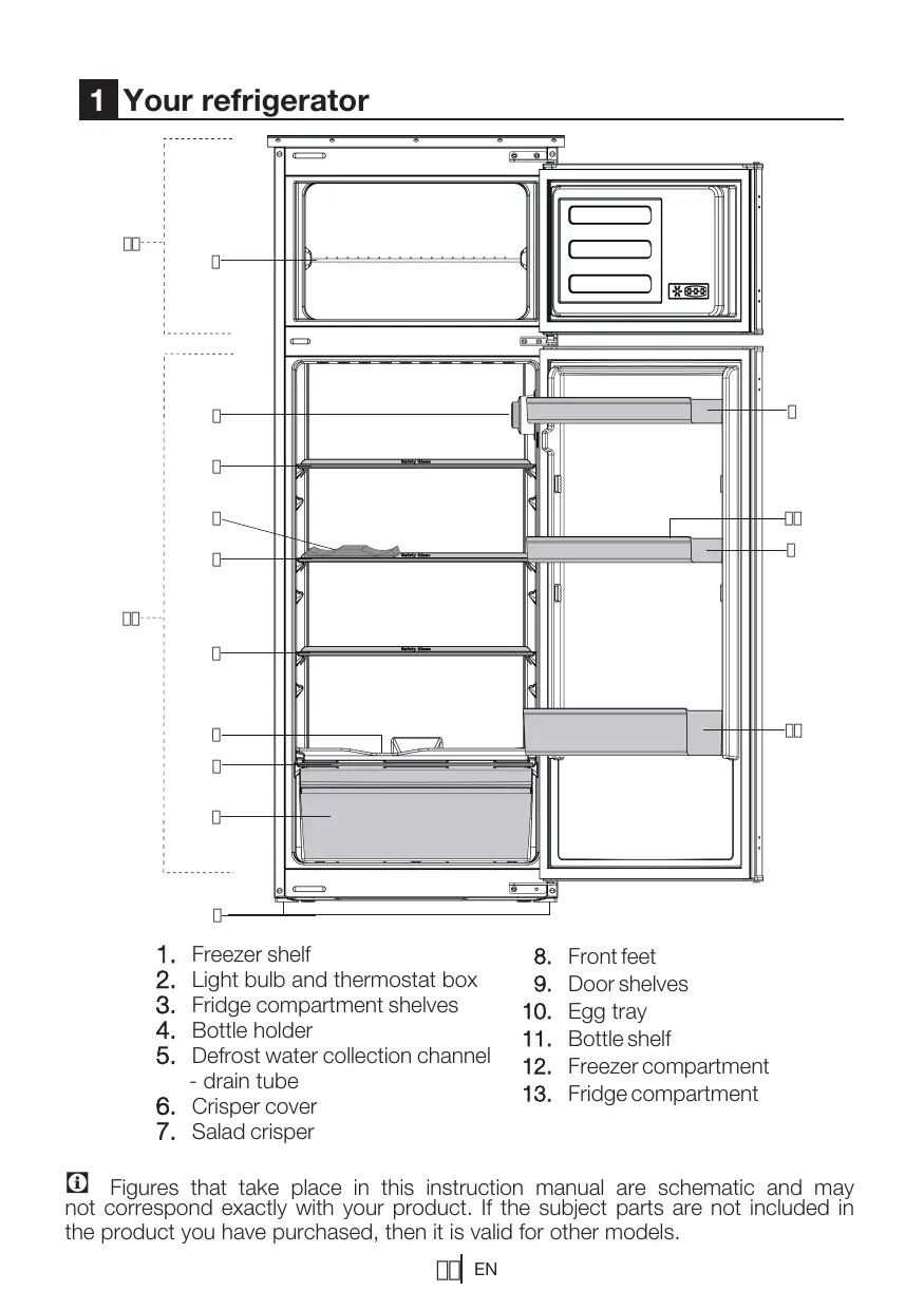 Front feet Door shelves Egg tray Bottle shelf Freezer compartment Fridge compartment Figures that take place in this instruction manual are schematic and may not correspond exactly with your product. If the subject parts are not included in the product you have purchased, then it is valid for other models.