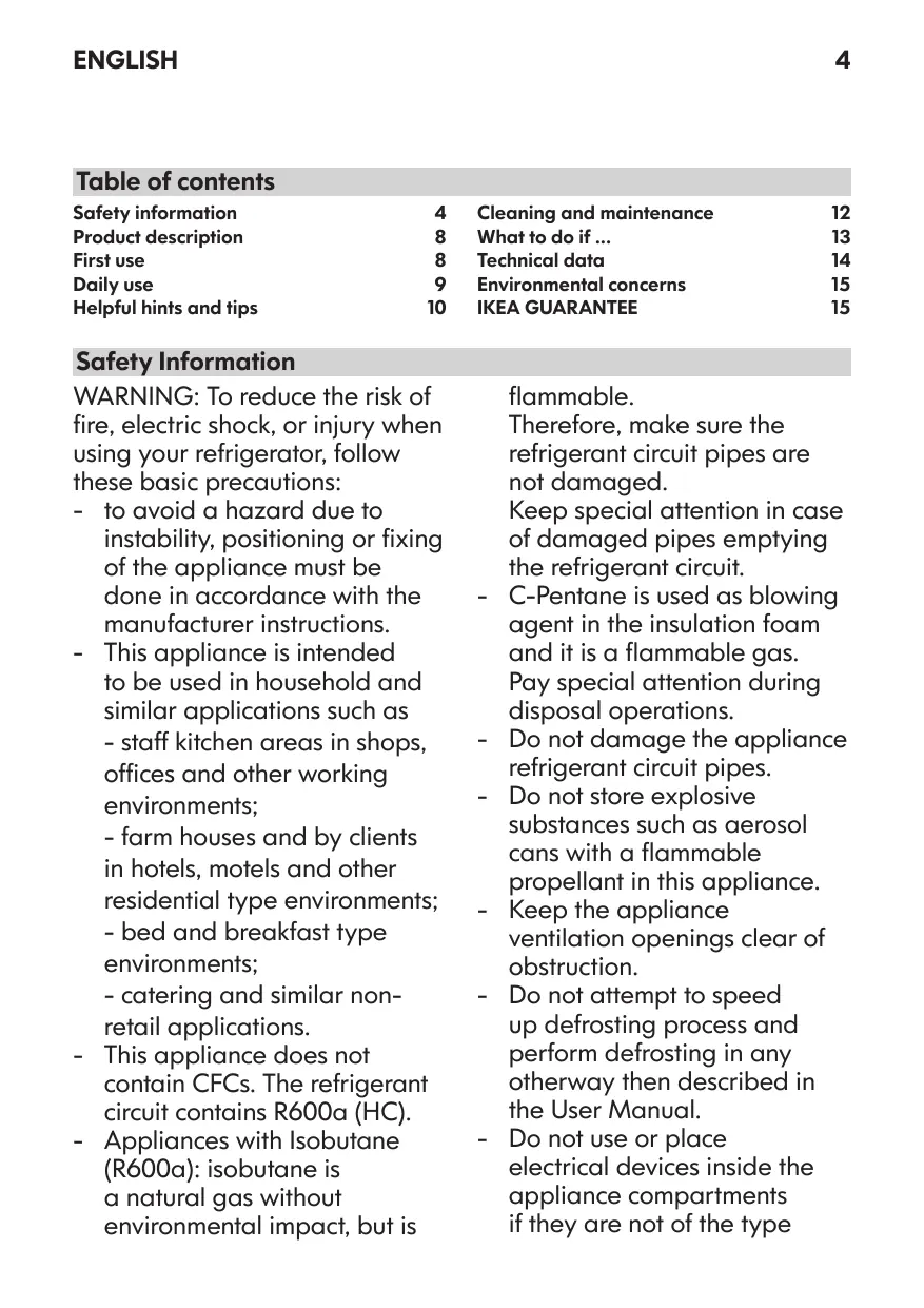 Pour utiliser au mieux votre appareil, lisez attentivement le présent Manuel d'utilisation, dans lequel figurent une description du produit et des conseils utiles. Conservez les présentes instructions pour référence future. 1. Après avoir déballé l'appareil, assurezvous qu'il n'est pas endommagé et que les portes ferment parfaitement. Tout problème fonctionnel doit être signalé au plus tôt au service après-vente d'IKEA. 2. Il est conseillé d'attendre au moins deux heures avant de mettre l'appareil sous tension, de façon à assurer l'efficacité optimale du circuit réfrigérant. 3. Nettoyez l'intérieur de l'appareil avant de l'utiliser.