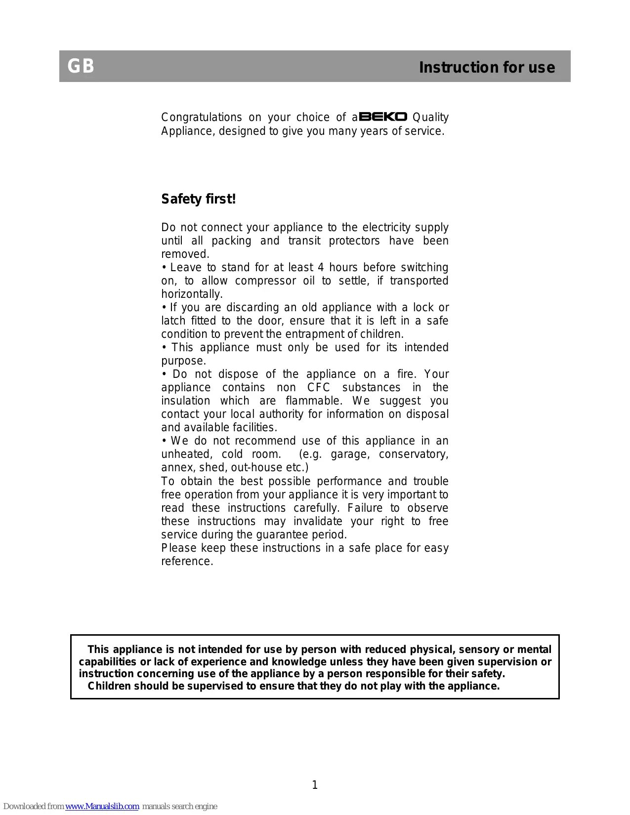 GB Instruction for use Congratulations on your choice of a Quality Appliance, designed to give you many years of service.