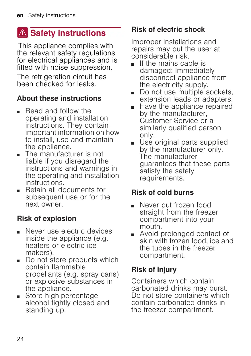 Risk of electric shock Improper installations and repairs may put the user at considerable risk. ■ If the mains cable is damaged: Immediately disconnect appliance from the electricity supply. ■ Do not use multiple sockets, extension leads or adapters. ■ Have the appliance repaired by the manufacturer, Customer Service or a similarly qualified person only. ■ Use original parts supplied by the manufacturer only. The manufacturer guarantees that these parts satisfy the safety requirements. Risk of cold burns ■