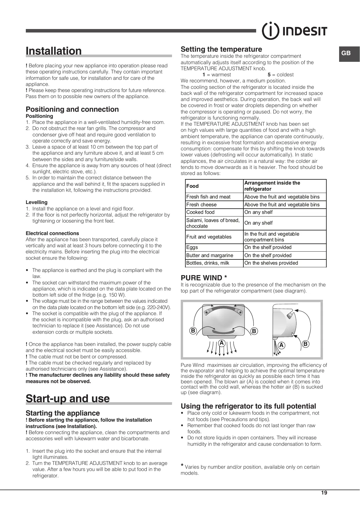 TEMPERATURE ADJUSTMENT knob. 1 = warmest 5 = coldest We recommend, however, a medium position. The cooling section of the refrigerator is located inside the back wall of the refrigerator compartment for increased space and improved aesthetics. During operation, the back wall will be covered in frost or water droplets depending on whether the compressor is operating or paused. Do not worry, the refrigerator is functioning normally. If the TEMPERATURE ADJUSTMENT knob has been set on high values with large quantities of food and with a high ambient temperature, the appliance can operate continuously, resulting in excessive frost formation and excessive energy consumption: compensate for this by shifting the knob towards lower values (defrosting will occur automatically). In static appliances, the air circulates in a natural way: the colder air tends to move downwards as it is heavier. The food should be stored as follows: