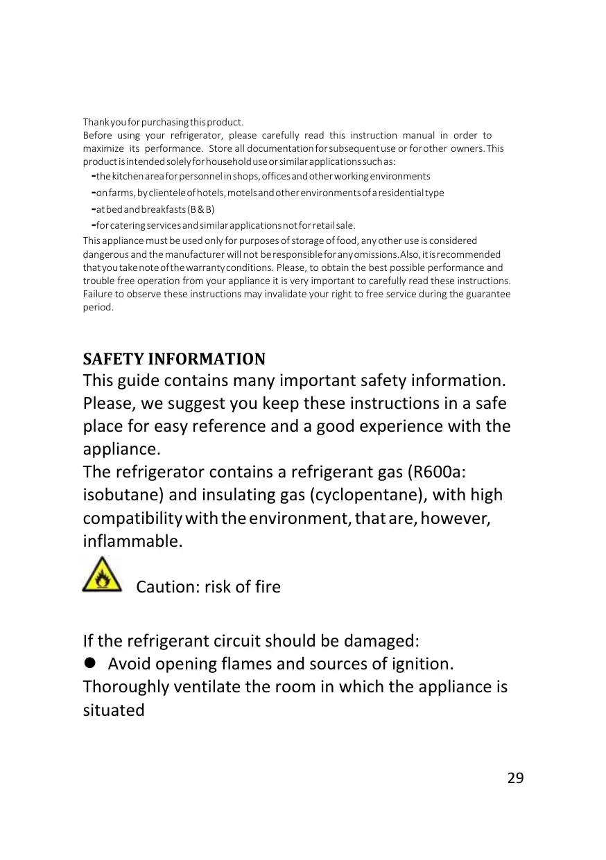 Please, we suggest you keep these instructions in a safe place for easy reference and a good experience with the appliance. The refrigerator contains a refrigerant gas (R600a: isobutane) and insulating gas (cyclopentane), with high compatibility with the environment, that are, however, inflammable. Caution: risk of fire If the refrigerant circuit should be damaged: Avoid opening flames and sources of ignition. Thoroughly ventilate the room in which the appliance is situated Percentage running 29