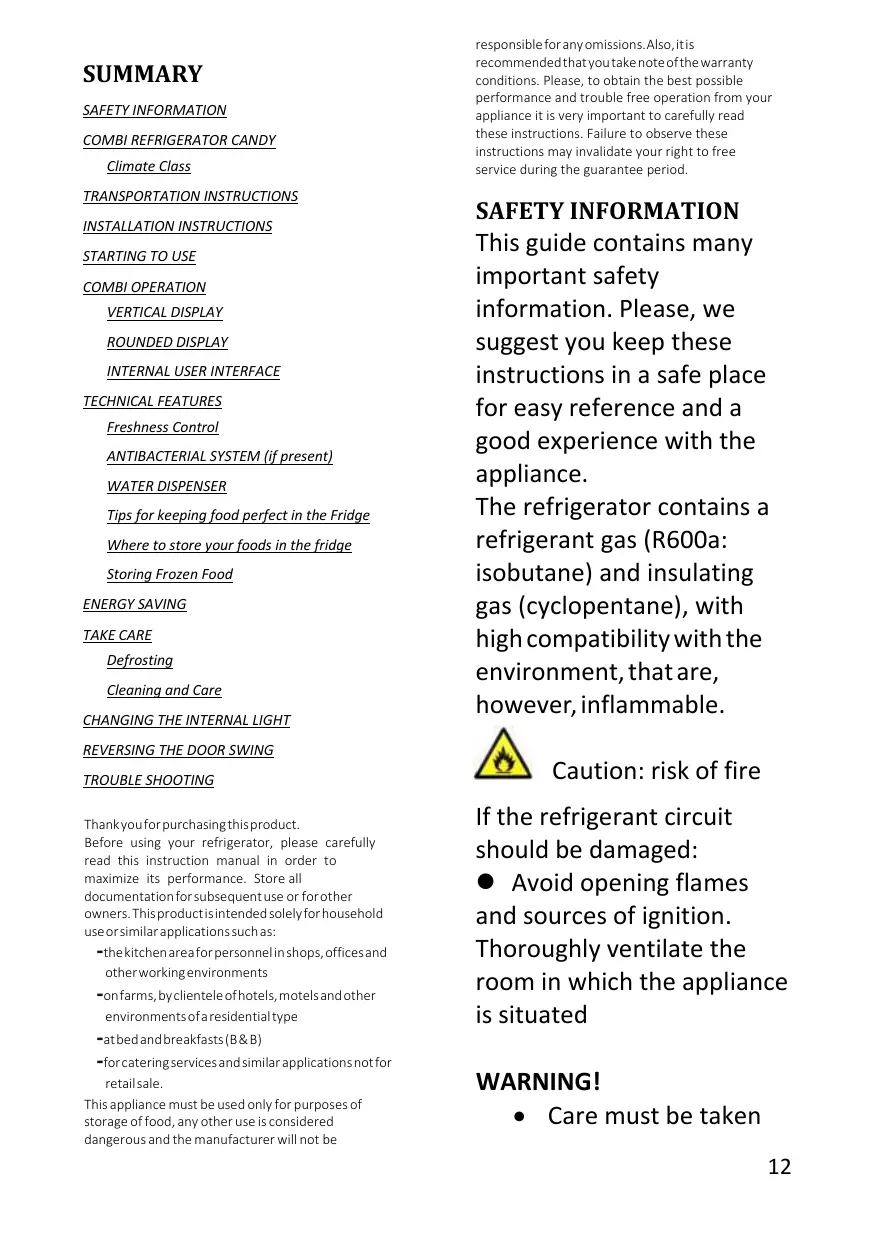 SUMMARY SAFETY INFORMATION COMBI REFRIGERATOR CANDY Climate Class