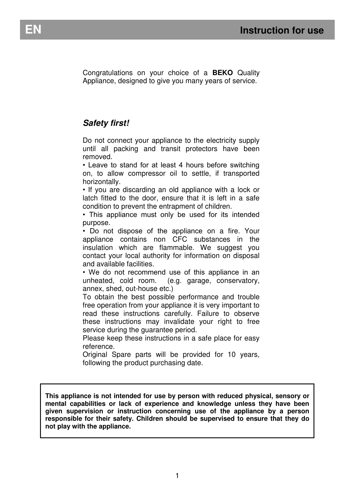 Congratulations on your choice of a BEKO Quality Appliance, designed to give you many years of service.