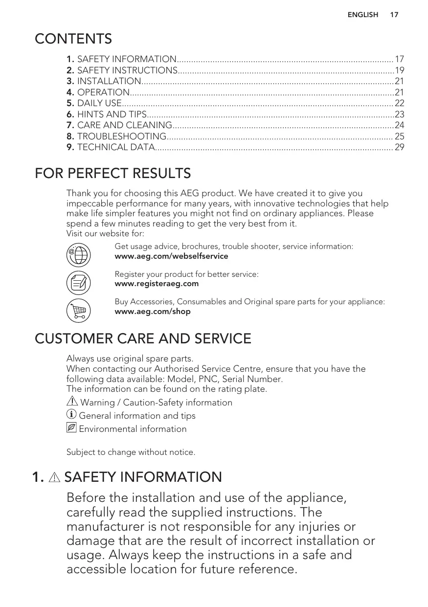 CONTENTS 1. SAFETY INFORMATION 17 2. SAFETY INSTRUCTIONS19 3. INSTALLATION21 4. OPERATION21 5. DAILY USE 22 6. HINTS AND TIPS23 7. CARE AND CLEANING24 8. TROUBLESHOOTING 25 9. TECHNICAL DATA 29