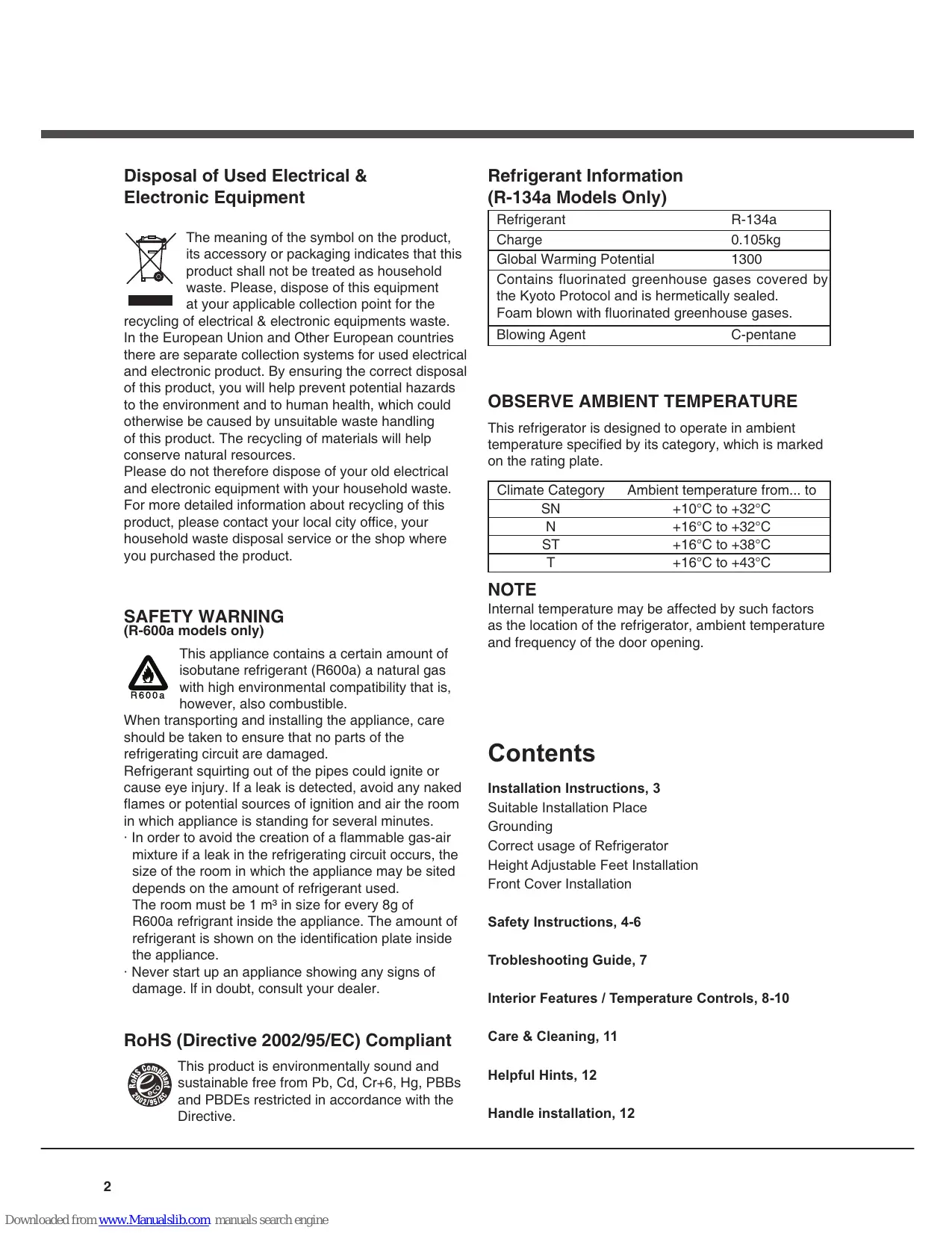 Installation Instructions, 3 Suitable Installation Place Grounding Correct usage of Refrigerator Height Adjustable Feet Installation Front Cover Installation Safety Instructions, 4-6 Trobleshooting Guide, 7 Interior Features / Temperature Controls, 8-10 Care & Cleaning, 11 Helpful Hints, 12 Handle installation, 12