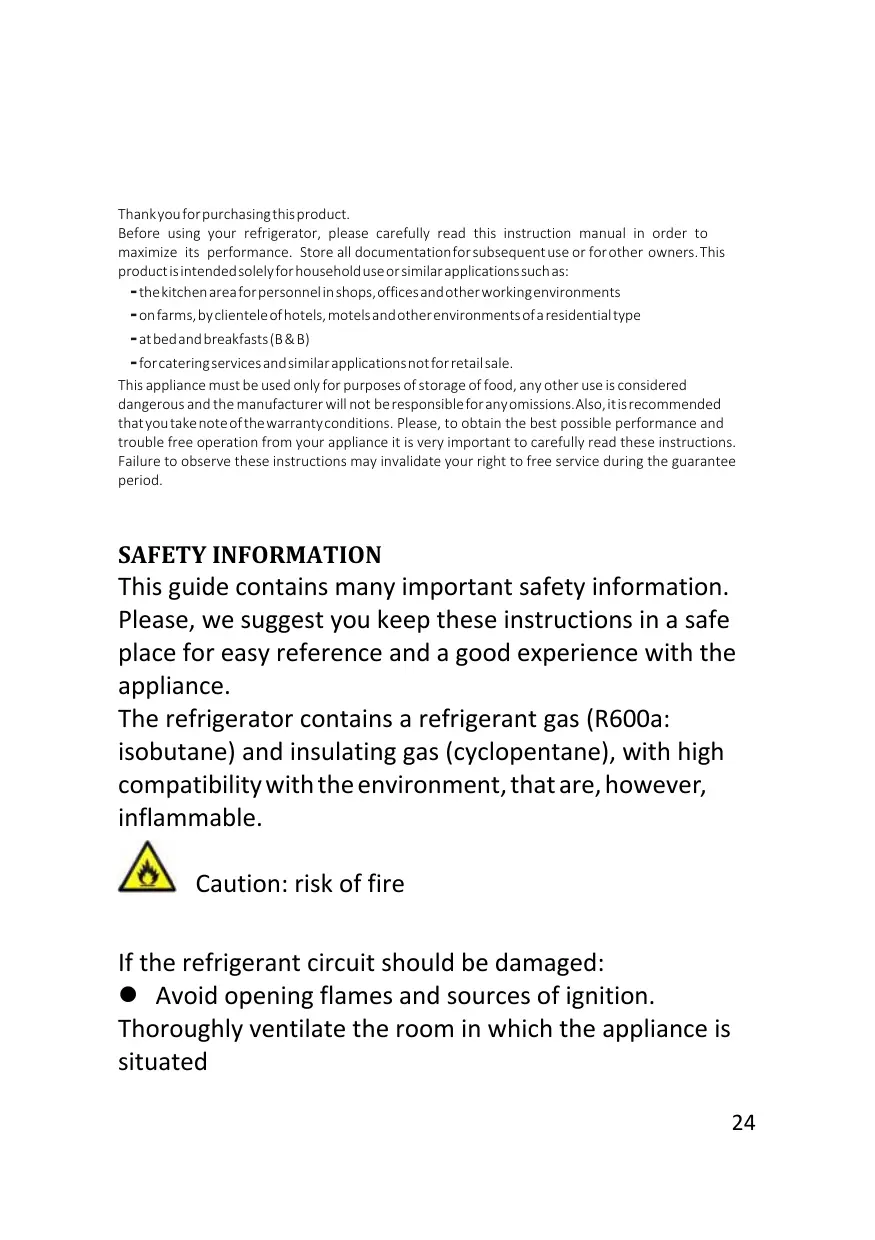 Please, we suggest you keep these instructions in a safe place for easy reference and a good experience with the appliance. The refrigerator contains a refrigerant gas (R600a: isobutane) and insulating gas (cyclopentane), with high compatibility with the environment, that are, however, inflammable. Caution: risk of fire If the refrigerant circuit should be damaged: Avoid opening flames and sources of ignition. Thoroughly ventilate the room in which the appliance is situated 24