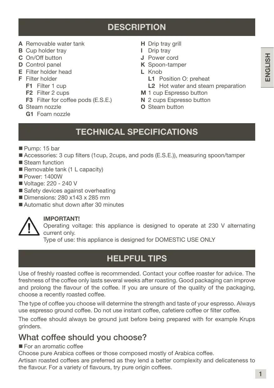 Type of use: this appliance is designed for DOMESTIC USE ONLY HELPFUL TIPS Use of freshly roasted coffee is recommended. Contact your coffee roaster for advice. The freshness of the coffee only lasts several weeks after roasting. Good packaging can improve and prolong the flavour of the coffee. If you are unsure of the quality of the packaging, choose a recently roasted coffee.