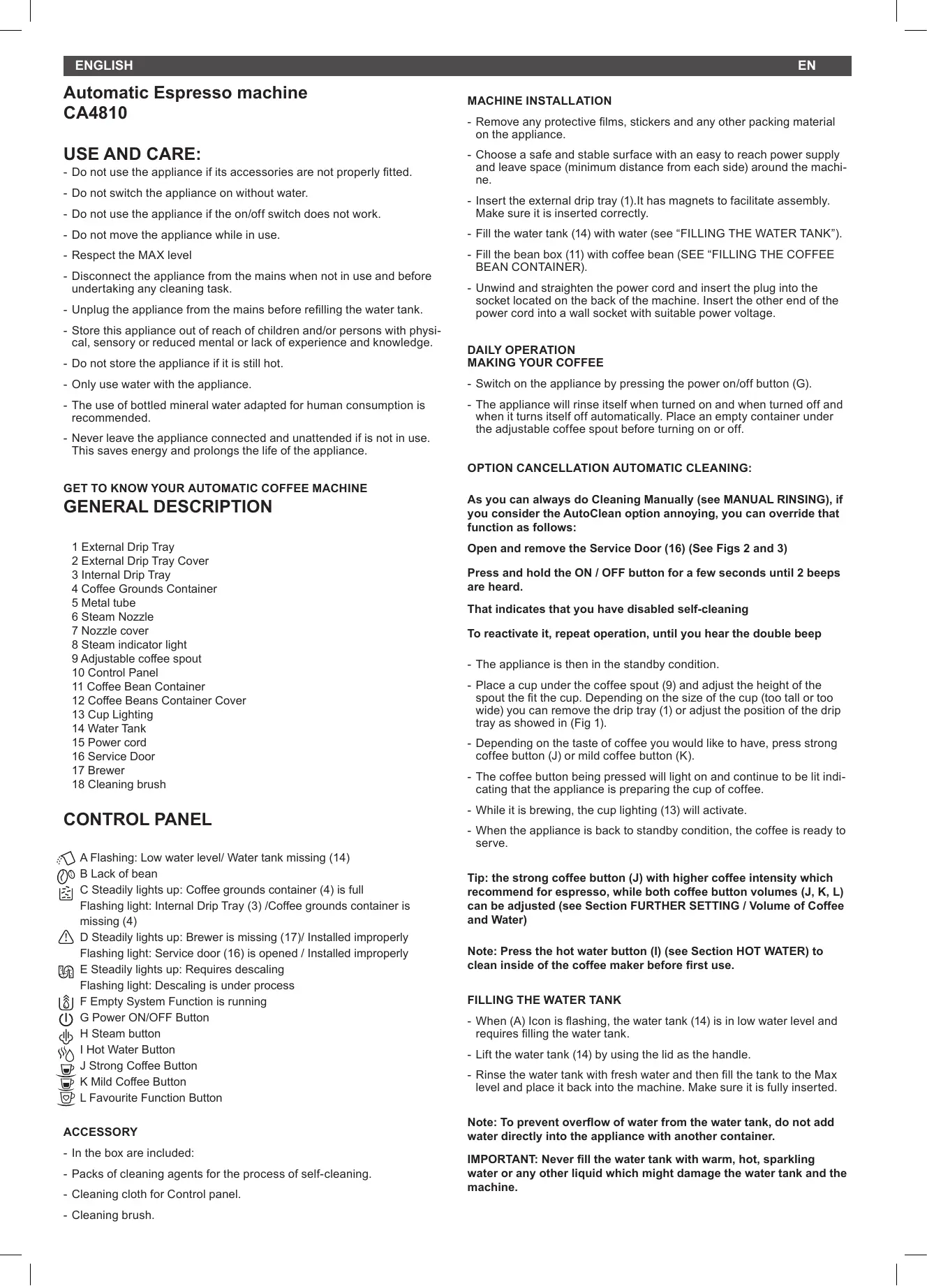 Open and remove the Service Door (16) (See Figs 2 and 3) Press and hold the ON / OFF button for a few seconds until 2 beeps are heard. That indicates that you have disabled self-cleaning To reactivate it, repeat operation, until you hear the double beep -- The appliance is then in the standby condition. -- Place a cup under the coffee spout (9) and adjust the height of the spout the fit the cup. Depending on the size of the cup (too tall or too wide) you can remove the drip tray (1) or adjust the position of the drip tray as showed in (Fig 1). -- Depending on the taste of coffee you would like to have, press strong coffee button (J) or mild coffee button (K). -- The coffee button being pressed will light on and continue to be lit indicating that the appliance is preparing the cup of coffee. -- While it is brewing, the cup lighting (13) will activate. -- When the appliance is back to standby condition, the coffee is ready to serve. Tip: the strong coffee button (J) with higher coffee intensity which recommend for espresso, while both coffee button volumes (J, K, L) can be adjusted (see Section FURTHER SETTING / Volume of Coffee and Water) Note: Press the hot water button (I) (see Section HOT WATER) to clean inside of the coffee maker before first use. FILLING THE WATER TANK -- When (A) Icon is flashing, the water tank (14) is in low water level and requires filling the water tank. -- Lift the water tank (14) by using the lid as the handle. -- Rinse the water tank with fresh water and then fill the tank to the Max level and place it back into the machine. Make sure it is fully inserted. Note: To prevent overflow of water from the water tank, do not add water directly into the appliance with another container. IMPORTANT: Never fill the water tank with warm, hot, sparkling water or any other liquid which might damage the water tank and the machine.