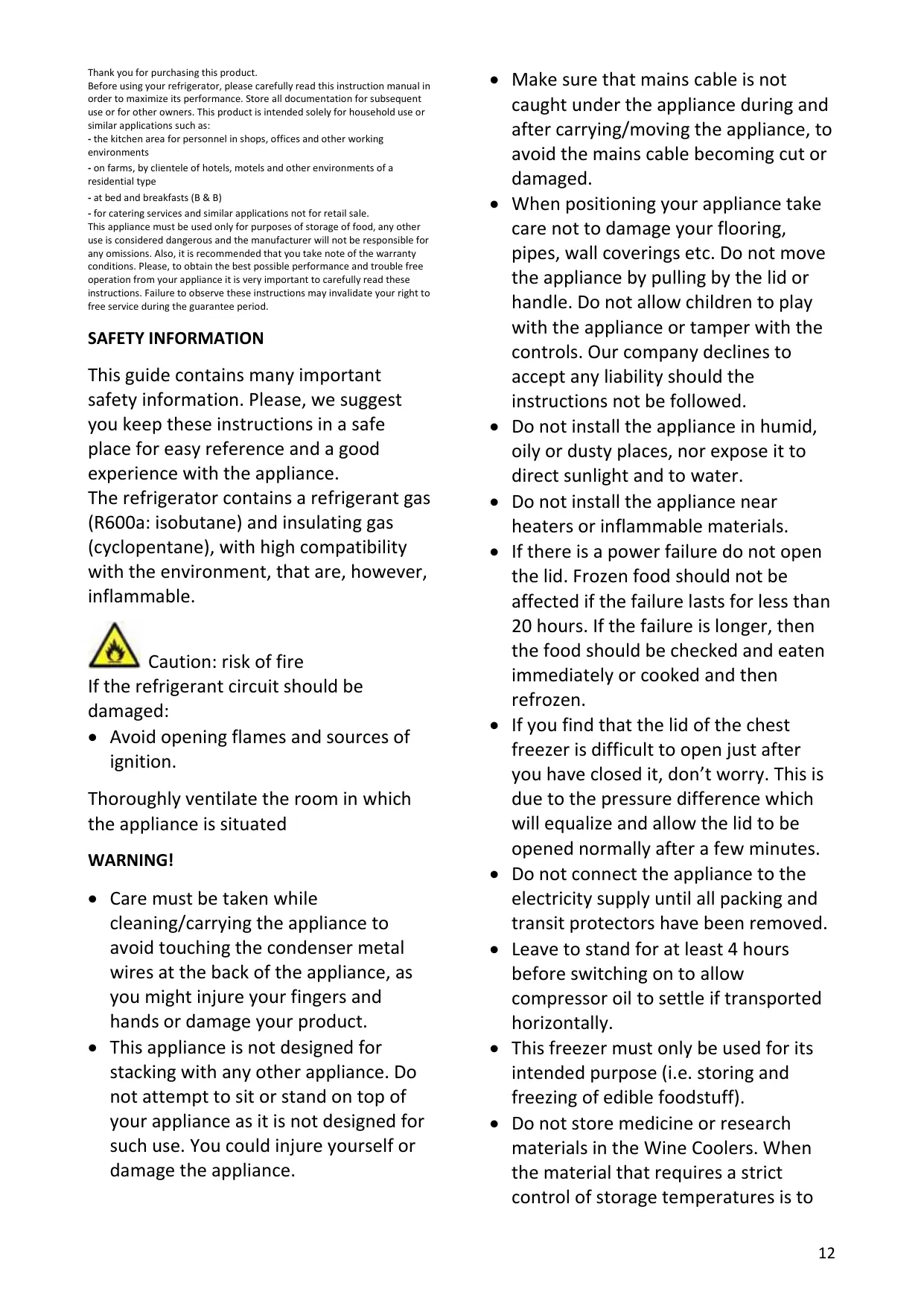• When positioning your appliance take care not to damage your flooring, pipes, wall coverings etc. Do not move the appliance by pulling by the lid or handle. Do not allow children to play with the appliance or tamper with the controls. Our company declines to accept any liability should the instructions not be followed. • Do not install the appliance in humid, oily or dusty places, nor expose it to direct sunlight and to water. • Do not install the appliance near heaters or inflammable materials. • If there is a power failure do not open the lid. Frozen food should not be affected if the failure lasts for less than 20 hours. If the failure is longer, then the food should be checked and eaten immediately or cooked and then refrozen. • If you find that the lid of the chest freezer is difficult to open just after you have closed it, don’t worry. This is due to the pressure difference which will equalize and allow the lid to be opened normally after a few minutes. • Do not connect the appliance to the electricity supply until all packing and transit protectors have been removed. • Leave to stand for at least 4 hours before switching on to allow compressor oil to settle if transported horizontally. • This freezer must only be used for its intended purpose (i.e. storing and freezing of edible foodstuff). • Do not store medicine or research materials in the Wine Coolers. When the material that requires a strict control of storage temperatures is to 12