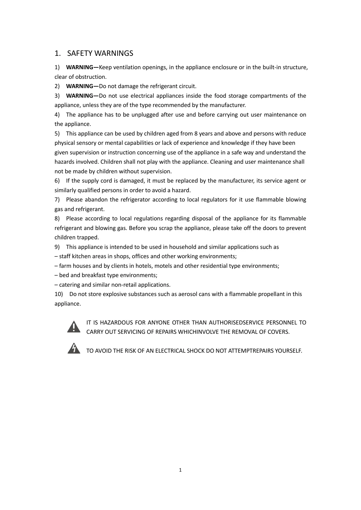 3) AVERTISSEMENT- N’utilisez pas les appareils électriques autres que ceux recommandés par le fabricant à l’intérieur des compartiments de stockage d’aliments de votre appareil. 4) Vous devez débrancher l’appareil après utilisation et avant d’effectuer l’entretien. 5) Cet appareil peut être utilisé par des enfants âgés de 8 ans et plus ainsi que par des personnes ayant des capacités physiques, sensorielles ou mentales réduites ou manquant d’expérience à condition qu’ils aient été formés sur l’utilisation de l’appareil en toute sécurité et qu’ils comprennent les risques y relatifs. Les enfants ne doivent pas jouer avec l’appareil. Le nettoyage et l’entretien ne doivent pas être effectués par les enfants sans surveillance. 6) Si le cordon d’alimentation est endommagé, il doit être remplacé par le fabricant, son représentant ou par des personnes qualifiées afin d’éviter tout risque. 7) Veuillez mettre au rebut ce réfrigérateur conformément aux règlementations locales puisqu’il utilise du gaz inflammable et du réfrigérant. 8) Veuillez vous conformer à la législation locale pour la mise au rebut de l’appareil en raison du réfrigérant et du gaz inflammable qui y sont contenus. Avant de mettre l’appareil au rebut, veuillez démonter les portes pour empêcher que les enfants ne soient coincés à l’intérieur. 9) Cet appareil est conçu pour une utilisation domestique et les endroits similaires, notamment - les espaces cuisines dans les boutiques, les bureaux et autres environnements de travail - Les maisons de campagne, les chambres d’hôtel, de motel et d’autres types de résidence ; - les chambres d’hôtes -les restaurants et les espaces semblables de vente au détail 10) Ne stockez pas de substances explosives comme les aérosols avec un agent propulseur inflammable dans cet appareil