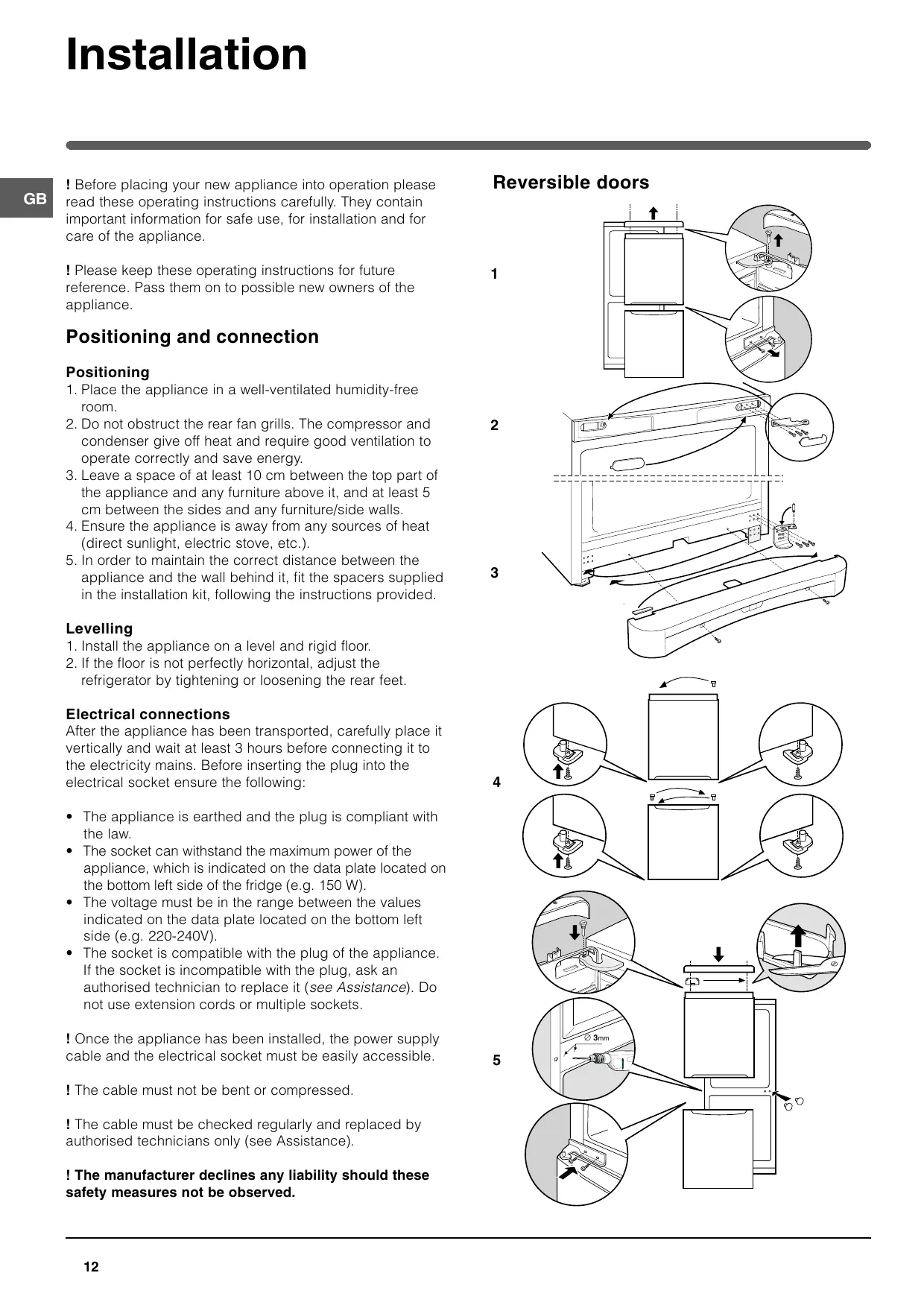 • The socket can withstand the maximum power of the appliance, which is indicated on the data plate located on the bottom left side of the fridge (e.g. 150 W). • The voltage must be in the range between the values indicated on the data plate located on the bottom left side (e.g. 220-240V). • The socket is compatible with the plug of the appliance. If the socket is incompatible with the plug, ask an authorised technician to replace it (see Assistance). Do not use extension cords or multiple sockets. #$Once the appliance has been installed, the power supply cable and the electrical socket must be easily accessible. #$The cable must not be bent or compressed. #$The cable must be checked regularly and replaced by authorised technicians only (see Assistance). ! The manufacturer declines any liability should these safety measures not be observed.