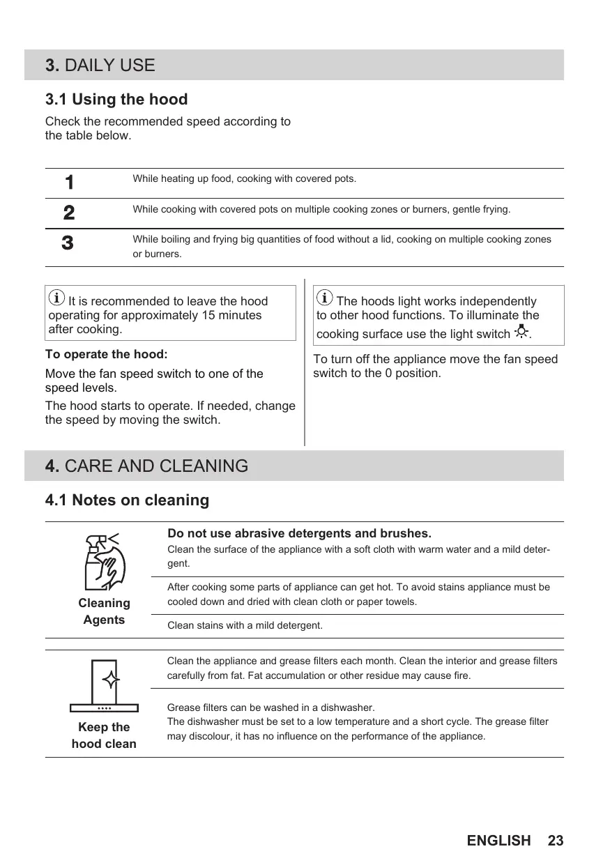 3.1 Using the hood Check the recommended speed according to the table below. While heating up food, cooking with covered pots. While cooking with covered pots on multiple cooking zones or burners, gentle frying. While boiling and frying big quantities of food without a lid, cooking on multiple cooking zones or burners.