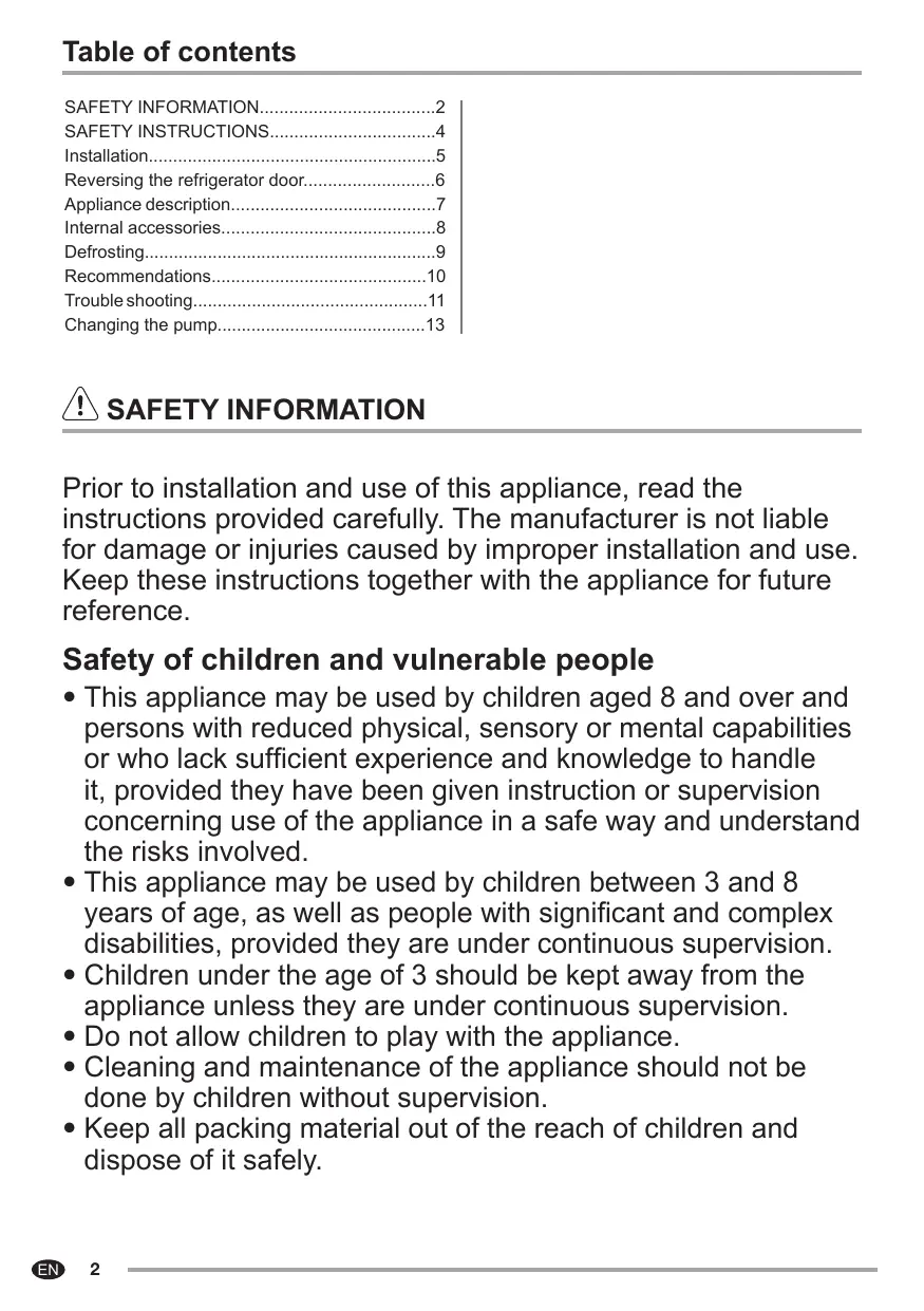SAFETY INFORMATION Prior to installation and use of this appliance, read the instructions provided carefully. The manufacturer is not liable for damage or injuries caused by improper installation and use. Keep these instructions together with the appliance for future reference.