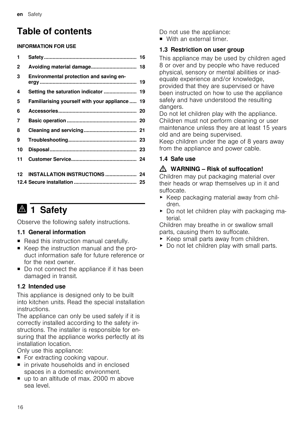 This appliance is designed only to be built into kitchen units. Read the special installation instructions. The appliance can only be used safely if it is correctly installed according to the safety instructions. The installer is responsible for ensuring that the appliance works perfectly at its installation location. Only use this appliance: ¡ For extracting cooking vapour. ¡ in private households and in enclosed spaces in a domestic environment. ¡ up to an altitude of max. 2000 m above sea level.