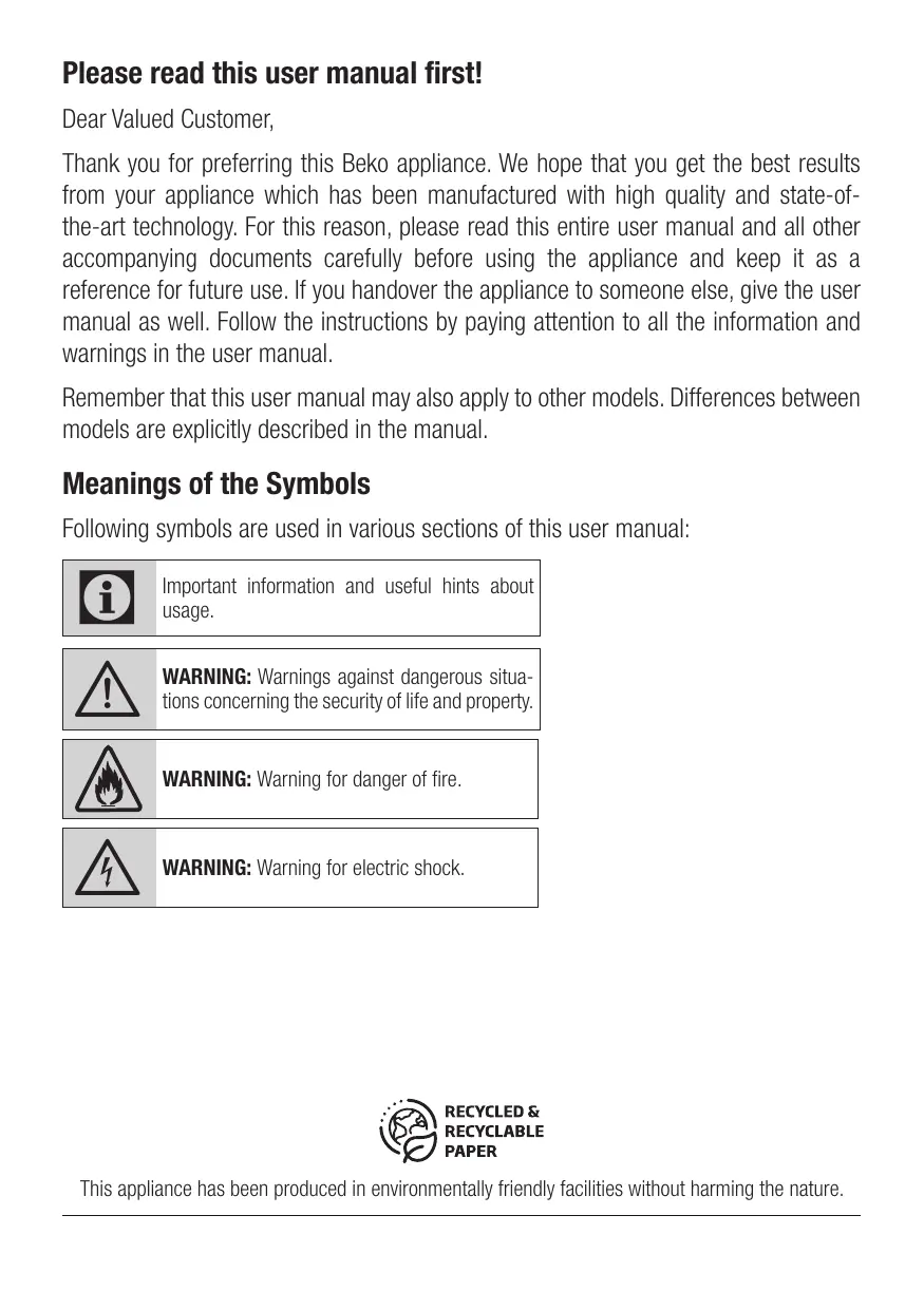 Please read this user manual first! Dear Valued Customer, Thank you for preferring this Beko appliance. We hope that you get the best results from your appliance which has been manufactured with high quality and state-ofthe-art technology. For this reason, please read this entire user manual and all other accompanying documents carefully before using the appliance and keep it as a reference for future use. If you handover the appliance to someone else, give the user manual as well. Follow the instructions by paying attention to all the information and warnings in the user manual. Remember that this user manual may also apply to other models. Differences between models are explicitly described in the manual.