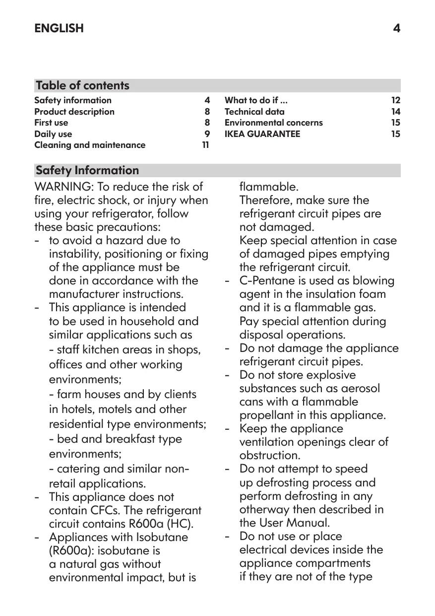 Pour utiliser au mieux votre appareil, lisez attentivement le présent Manuel d’utilisation, dans lequel figurent une description du produit et des conseils utiles. Conservez les présentes instructions pour référence future. 1. Après avoir déballé l’appareil, assurezvous qu’il n’est pas endommagé et que les portes ferment parfaitement. Tout problème fonctionnel doit être signalé au plus tôt au service après-vente d’IKEA. 2. Il est conseillé d’attendre au moins deux heures avant de mettre l’appareil sous tension, de façon à assurer l’efficacité optimale du circuit réfrigérant. 3. Nettoyez l’intérieur de l’appareil avant de l’utiliser. Précautions et recommandations générales Installation et raccordement • Prenez garde d’endommager le revêtement de sol (parquet, par exemple) lorsque vous déplacez l’appareil. • N’installez pas l’appareil à proximité d’une source de chaleur. • Installez et mettez l’appareil de niveau sur un sol suffisamment solide pour supporter son poids, à un emplacement adapté à ses dimensions et à son usage. • L’appareil est réglé pour fonctionner dans la plage de température suivante, en fonction de la classe climatique indiquée sur la plaque signalétique. L’appareil risque de ne de pas fonctionner correctement s’il est laissé pendant une période prolongée à une température supérieure ou inférieure à la plage indiquée.