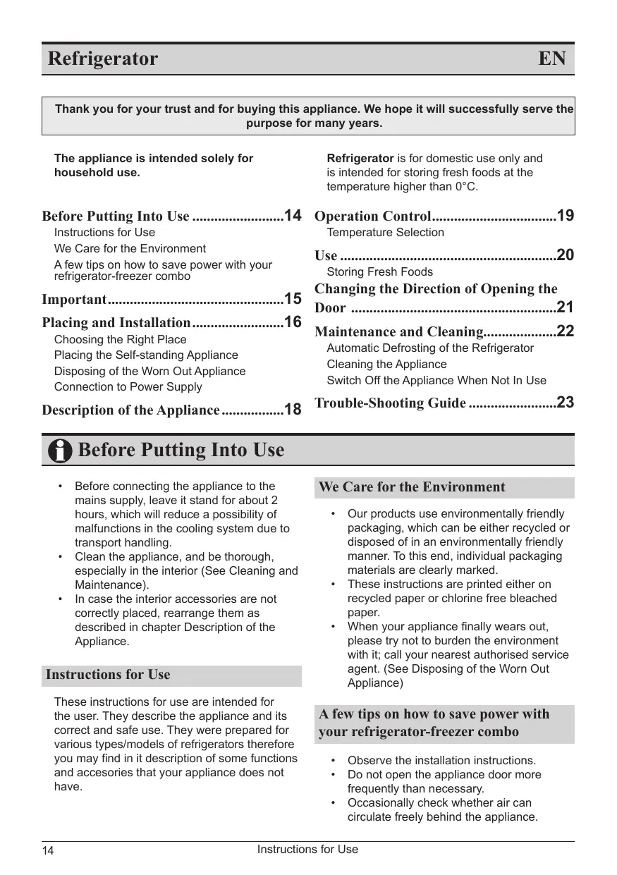 Before Putting Into Use 14 Operation Control 19 Instructions for Use We Care for the Environment A few tips on how to save power with your refrigerator-freezer combo