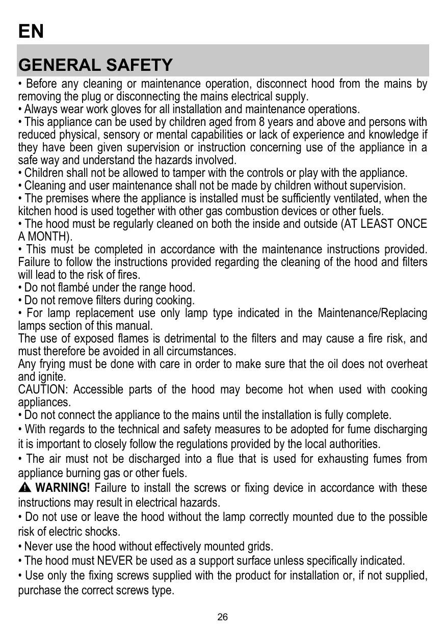 EN GENERAL SAFETY • Before any cleaning or maintenance operation, disconnect hood from the mains by removing the plug or disconnecting the mains electrical supply. • Always wear work gloves for all installation and maintenance operations. • This appliance can be used by children aged from 8 years and above and persons with reduced physical, sensory or mental capabilities or lack of experience and knowledge if they have been given supervision or instruction concerning use of the appliance in a safe way and understand the hazards involved. • Children shall not be allowed to tamper with the controls or play with the appliance. • Cleaning and user maintenance shall not be made by children without supervision. • The premises where the appliance is installed must be sufficiently ventilated, when the kitchen hood is used together with other gas combustion devices or other fuels. • The hood must be regularly cleaned on both the inside and outside (AT LEAST ONCE A MONTH). • This must be completed in accordance with the maintenance instructions provided. Failure to follow the instructions provided regarding the cleaning of the hood and filters will lead to the risk of fires. • Do not flambé under the range hood. • Do not remove filters during cooking. • For lamp replacement use only lamp type indicated in the Maintenance/Replacing lamps section of this manual. The use of exposed flames is detrimental to the filters and may cause a fire risk, and must therefore be avoided in all circumstances. Any frying must be done with care in order to make sure that the oil does not overheat and ignite. CAUTION: Accessible parts of the hood may become hot when used with cooking appliances. • Do not connect the appliance to the mains until the installation is fully complete. • With regards to the technical and safety measures to be adopted for fume discharging it is important to closely follow the regulations provided by the local authorities. • The air must not be discharged into a flue that is used for exhausting fumes from appliance burning gas or other fuels. WARNING! Failure to install the screws or fixing device in accordance with these instructions may result in electrical hazards. • Do not use or leave the hood without the lamp correctly mounted due to the possible risk of electric shocks. • Never use the hood without effectively mounted grids. • The hood must NEVER be used as a support surface unless specifically indicated. • Use only the fixing screws supplied with the product for installation or, if not supplied, purchase the correct screws type. 26