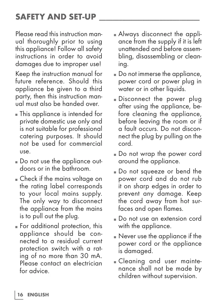 SAFETY AND SET-UP_ ______________________________ Please read this instruction manual thoroughly prior to using this appliance! Follow all safety instructions in order to avoid damages due to improper use! Keep the instruction manual for future reference. Should this appliance be given to a third party, then this instruction manual must also be handed over. This appliance is intended for private domestic use only and is not suitable for professional catering purposes. It should not be used for commercial use. Do not use the appliance outdoors or in the bathroom. Check if the mains voltage on the rating label corresponds to your local mains supply. The only way to disconnect the appliance from the mains is to pull out the plug. For additional protection, this appliance should be connected to a residual current protection switch with a rating of no more than 30 mA. Please contact an electrician for advice.