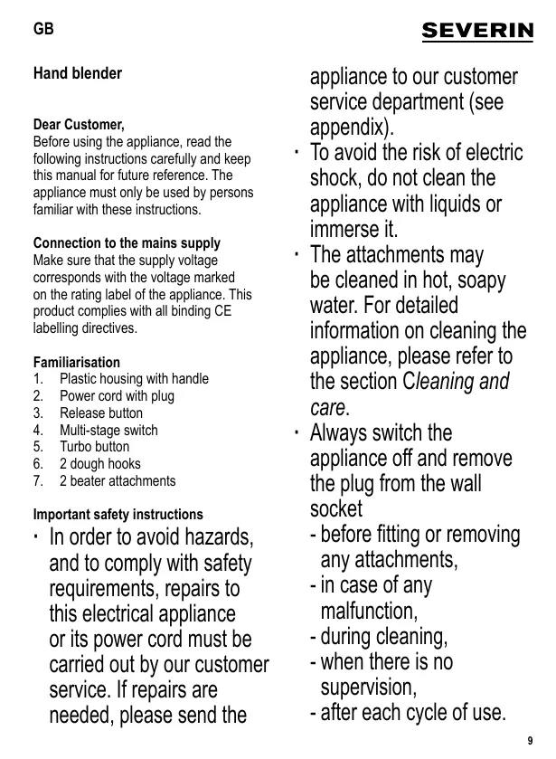 Dear Customer, Before using the appliance, read the following instructions carefully and keep this manual for future reference. The appliance must only be used by persons familiar with these instructions. Connection to the mains supply Make sure that the supply voltage corresponds with the voltage marked on the rating label of the appliance. This product complies with all binding CE labelling directives. Familiarisation 1. Plastic housing with handle 2. Power cord with plug 3. Release button 4. Multi-stage switch 5. Turbo button 6. 2 dough hooks 7. 2 beater attachments Important safety instructions