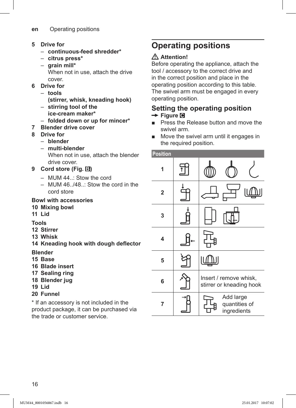 5 Drive for — continuous-feed shredder* — citrus press* — grain mill* When not in use, attach the drive cover. 6 Drive for — tools (stirrer, whisk, kneading hook) — stirring tool of the ice-cream maker* — folded down or up for mincer* 7 Blender drive cover 8 Drive for — blender — multi-blender When not in use, attach the blender drive cover. 9 Cord store (Fig. El) — MUM 44..: Stow the cord — MUM 46../48..: Stow the cord in the cord store Bowl with accessories 10 Mixing bowl 11 Lid Tools 12 Stirrer 13 Whisk 14 Kneading hook with dough deflector Blender 15 Base 16 Blade insert 17 Sealing ring 18 Blender jug 19 Lid 20 Funnel * If an accessory is not included in the product package, it can be purchased via the trade or customer service.