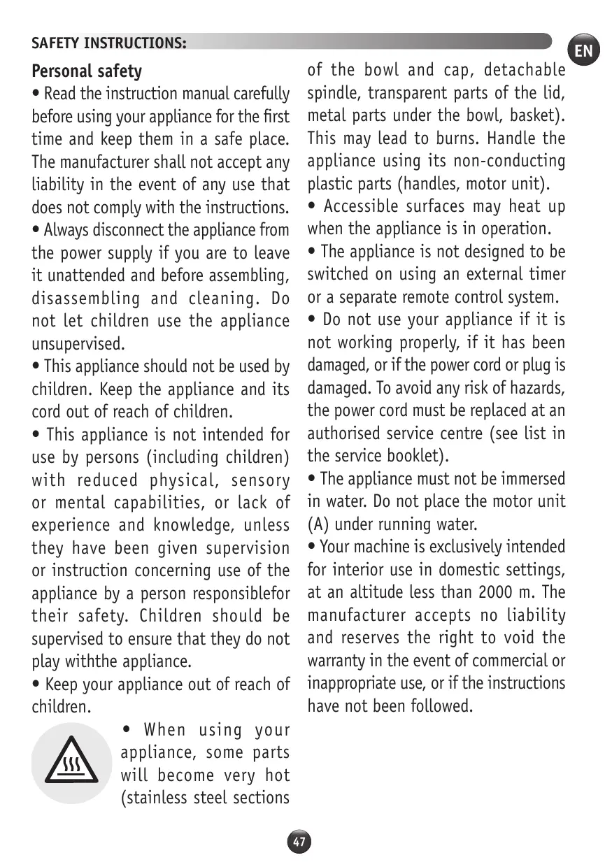 • Read the instruction manual carefully before using your appliance for the first time and keep them in a safe place. The manufacturer shall not accept any liability in the event of any use that does not comply with the instructions. • Always disconnect the appliance from the power supply if you are to leave it unattended and before assembling, disassembling and cleaning. Do not let children use the appliance unsupervised. • This appliance should not be used by children. Keep the appliance and its cord out of reach of children. • This appliance is not intended for use by persons (including children) with reduced physical, sensory or mental capabilities, or lack of experience and knowledge, unless they have been given supervision or instruction concerning use of the appliance by a person responsiblefor their safety. Children should be supervised to ensure that they do not play withthe appliance. • Keep your appliance out of reach of children. • When using your appliance, some parts will become very hot (stainless steel sections 47