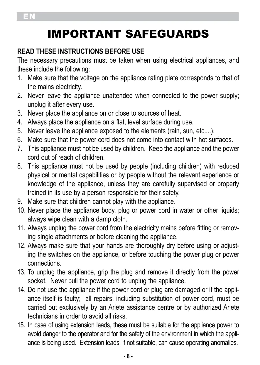 1. Make sure that the voltage on the appliance rating plate corresponds to that of the mains electricity. 2. Never leave the appliance unattended when connected to the power supply; unplug it after every use. 3. Never place the appliance on or close to sources of heat. 4. Always place the appliance on a flat, level surface during use. 5. Never leave the appliance exposed to the elements (rain, sun, etc....). 6. Make sure that the power cord does not come into contact with hot surfaces. 7. This appliance must not be used by children. Keep the appliance and the power cord out of reach of children. 8. This appliance must not be used by people (including children) with reduced physical or mental capabilities or by people without the relevant experience or knowledge of the appliance, unless they are carefully supervised or properly trained in its use by a person responsible for their safety. 9. Make sure that children cannot play with the appliance. 10. Never place the appliance body, plug or power cord in water or other liquids; always wipe clean with a damp cloth. 11. Always unplug the power cord from the electricity mains before fitting or removing single attachments or before cleaning the appliance. 12. Always make sure that your hands are thoroughly dry before using or adjusting the switches on the appliance, or before touching the power plug or power connections. 13. To unplug the appliance, grip the plug and remove it directly from the power socket. Never pull the power cord to unplug the appliance. 14. Do not use the appliance if the power cord or plug are damaged or if the appliance itself is faulty; all repairs, including substitution of power cord, must be carried out exclusively by an Ariete assistance centre or by authorized Ariete technicians in order to avoid all risks. 15. In case of using extension leads, these must be suitable for the appliance power to avoid danger to the operator and for the safety of the environment in which the appliance is being used. Extension leads, if not suitable, can cause operating anomalies. -8-